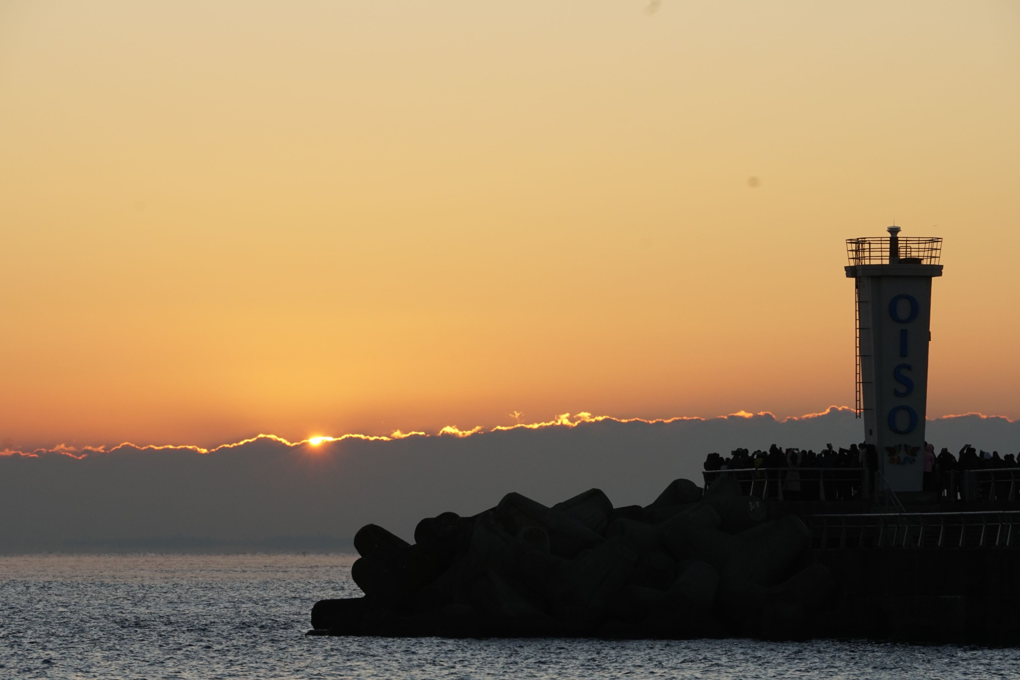 2023年元旦の大磯漁港の初日の出です。開門となった西堤防は鈴なりの見物客。