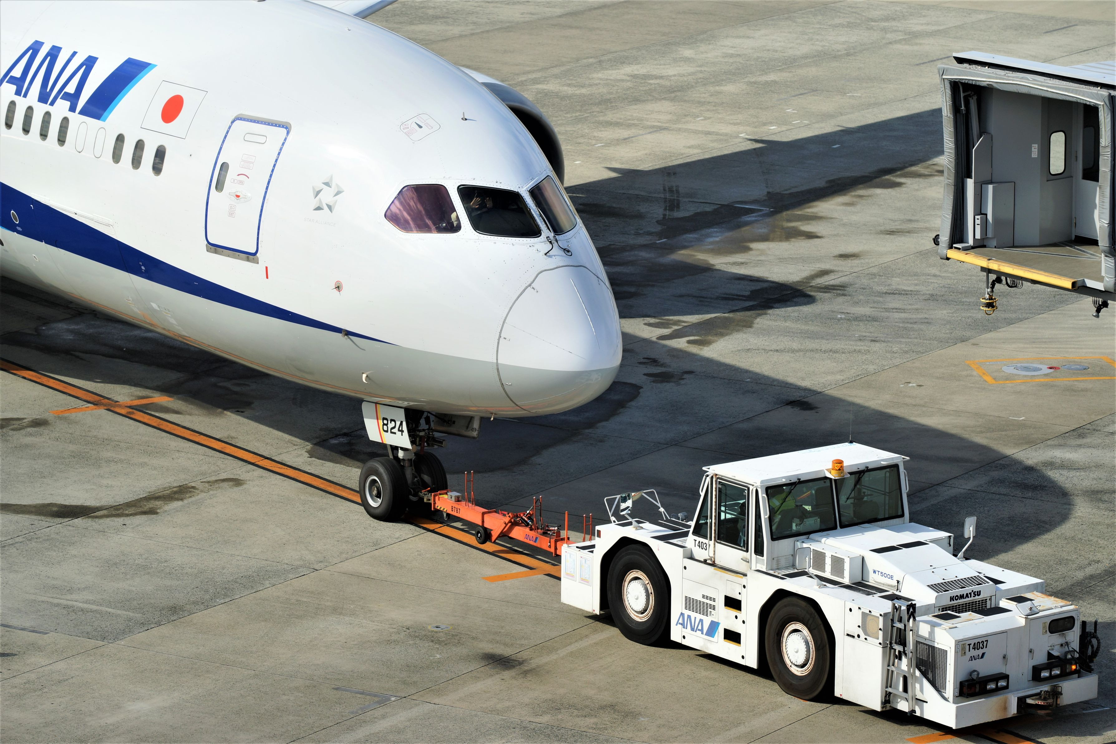 伊丹空港にて B787 Pushback 副機長が両手で懸命にバイバイ(@^^)/~~~ さては、正面の搭乗エリアに子供たちが居るのかな?