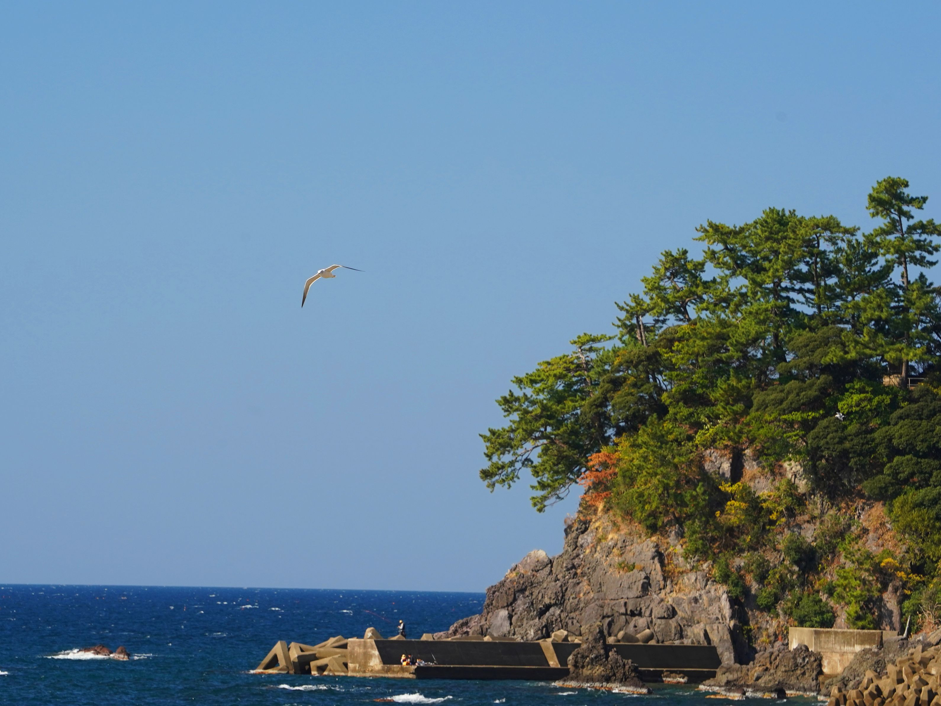 越前海岸で釣りを楽しむ人が多い日でした。カモメ?も多く飛んでいました。 鳥が、釣り人を餌として狙っているような構図にならないかと待ちましたが今回はこれが限界でした。