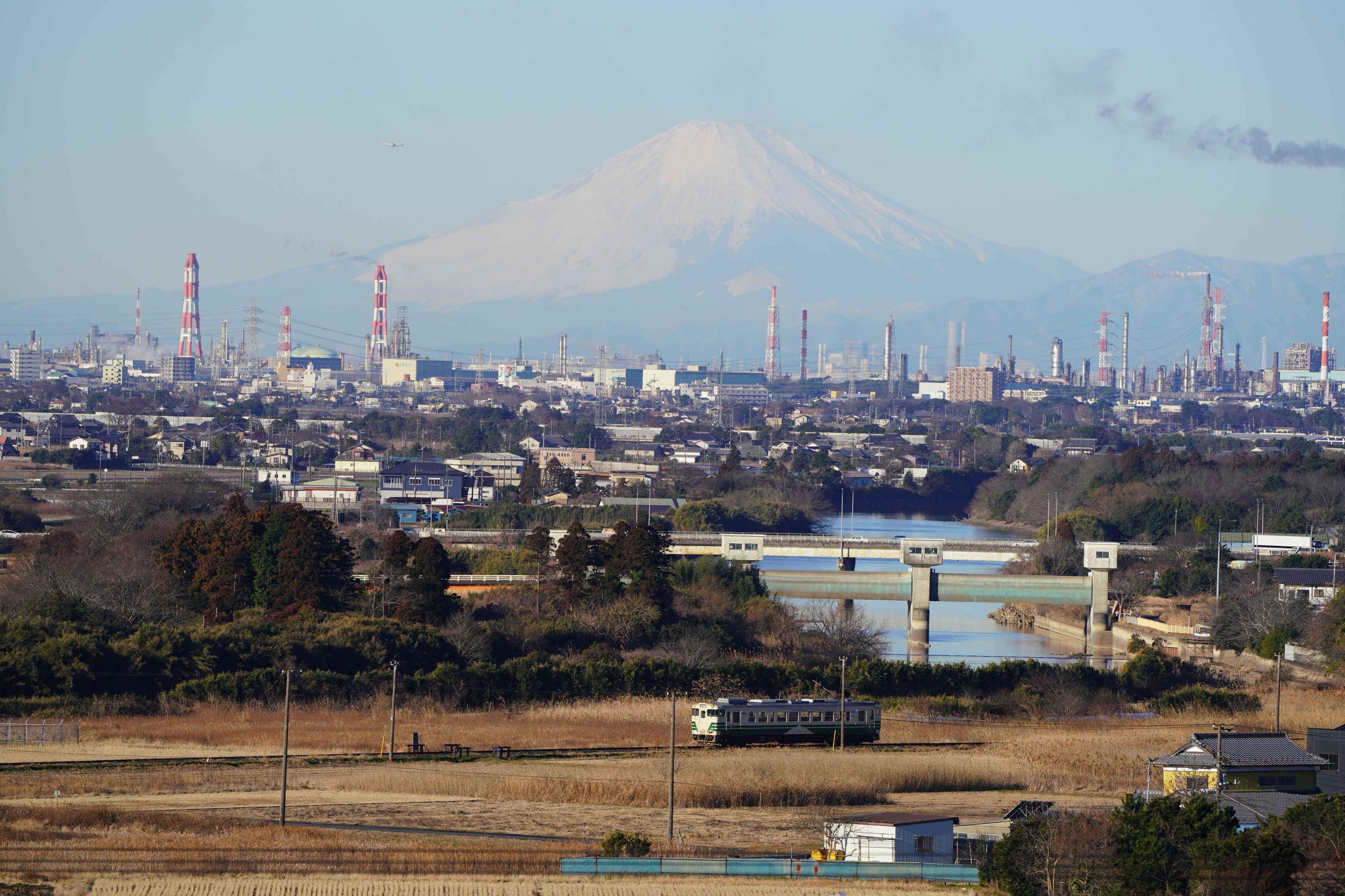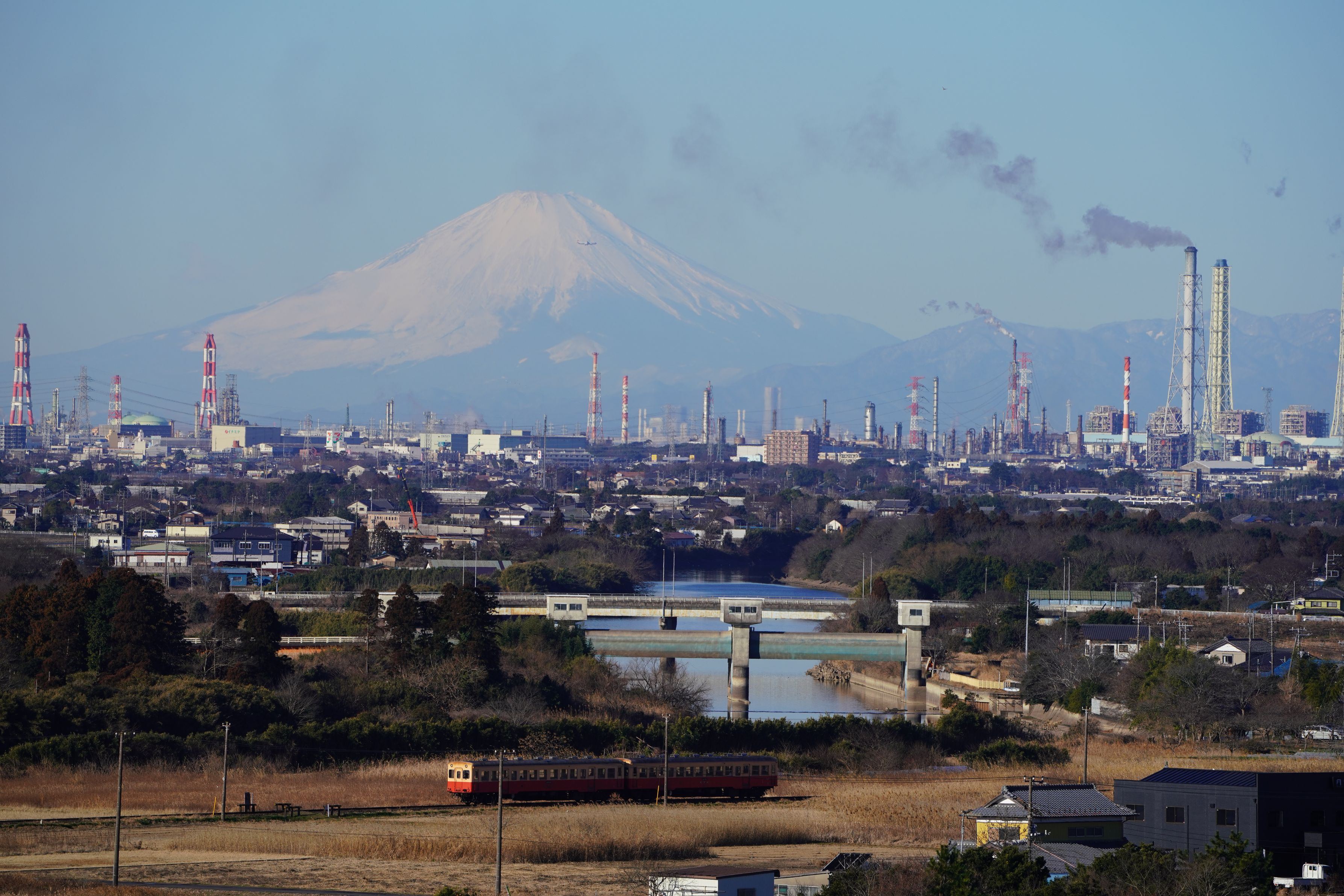 1月28日 待望の小湊鉄道富士山絡みを撮る事が出来ました。 夕暮れのシーンは以前撮れていますが、冬山の富士山はとれていませんでした。 *周りに三名のカメラマン、飛行機が絡んでくれると良いですよねと云うと そんな都合のいい事ないですよと云われましたた。 どちらもちゃんと入ってラッキーでした。\(^o^)/