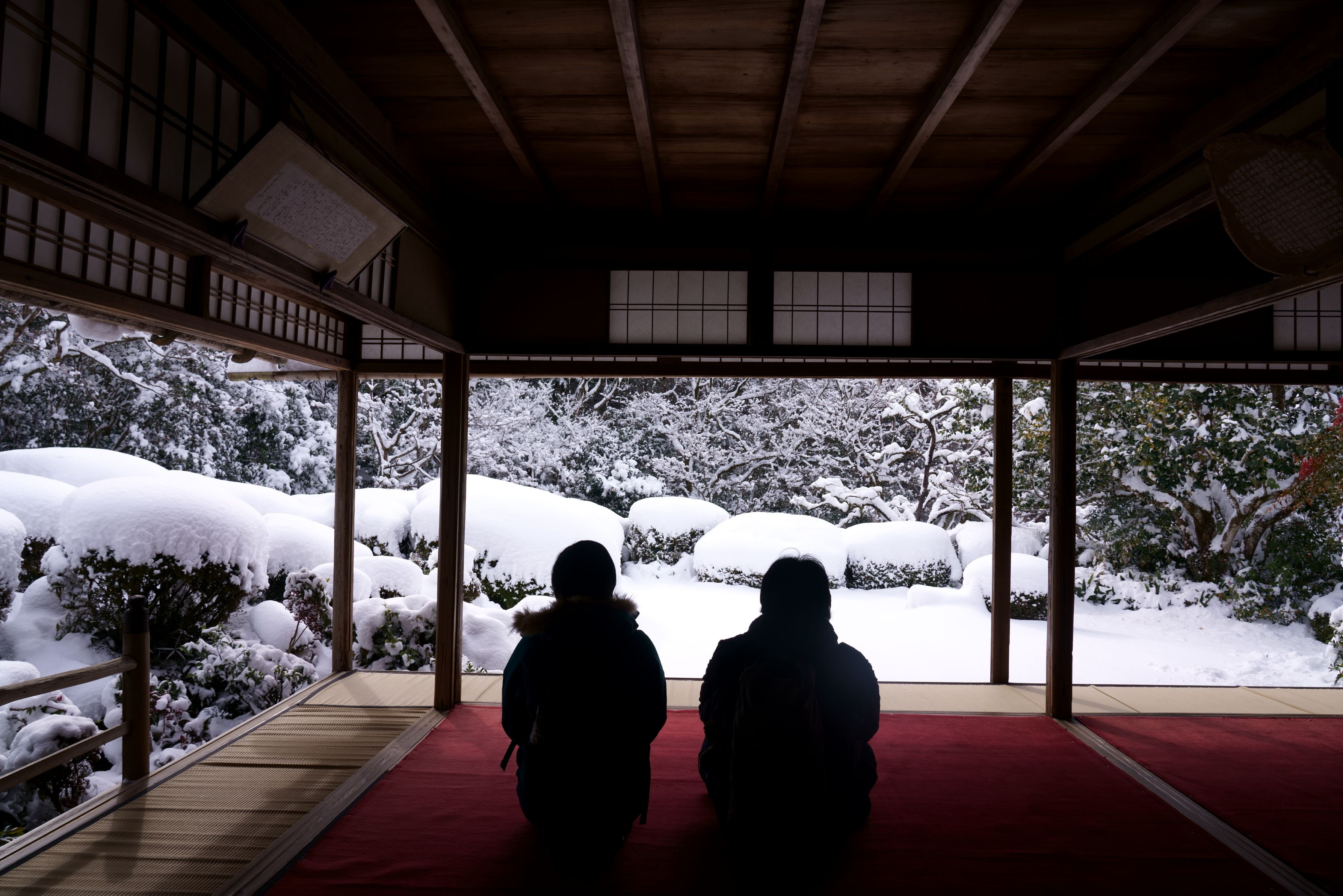 薄日がさす嘯月楼から庭を眺める 公開寺院に誰もいない光景は寂し過ぎるので、後ろ姿を拝借しました