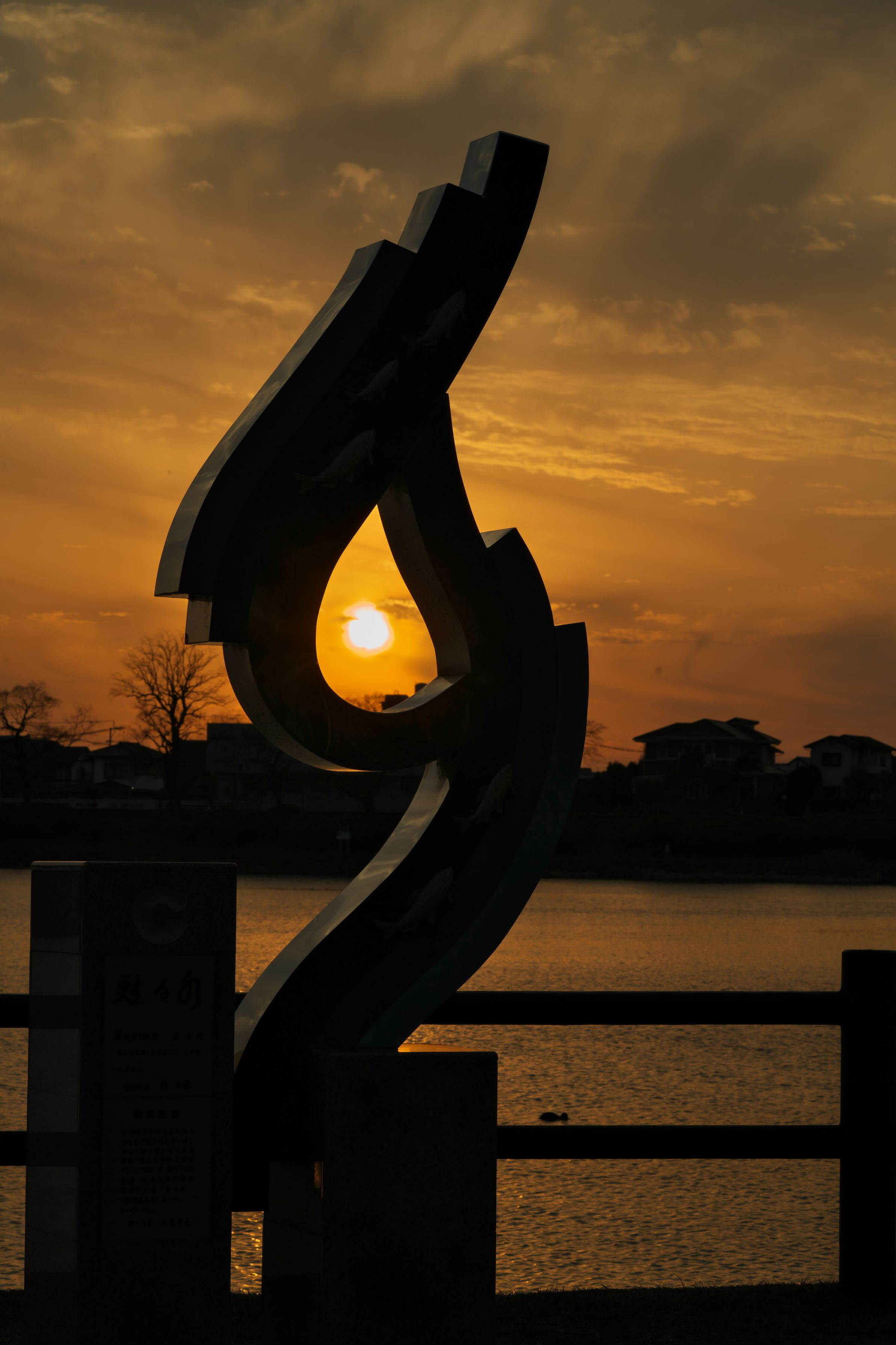 江津湖は水質環境の向上のために市民と行政が、一体となって取り組んだクリーン作戦「甦る水」100選に選ばれました。そのモニュメントに夕日がちょうど目のように映えていました。