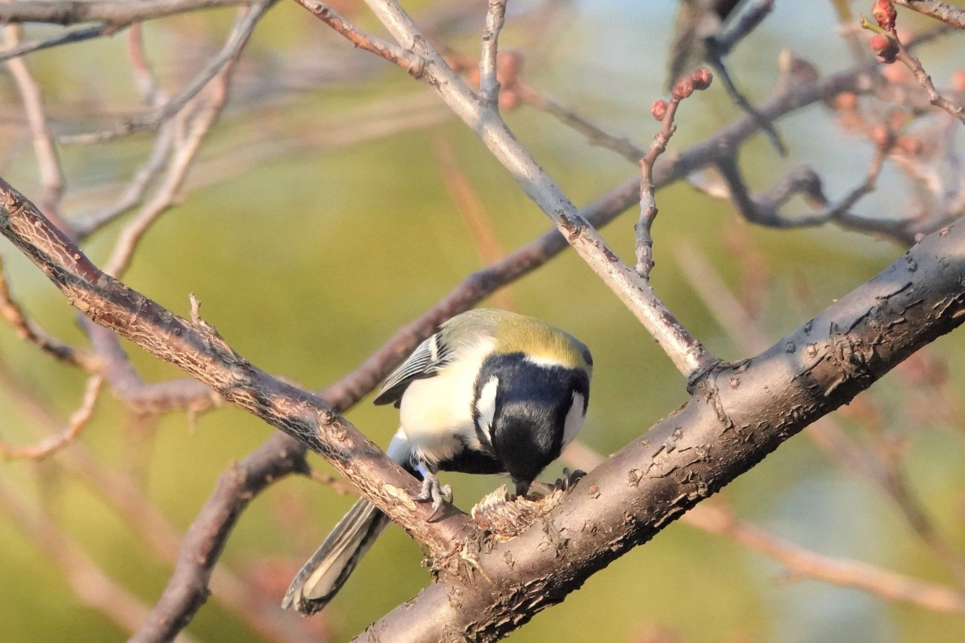 花木の蕾より、カマキリの卵の方が好みの様ですね。 無心に卵を突いています。 次回はウメジローが撮れますように。