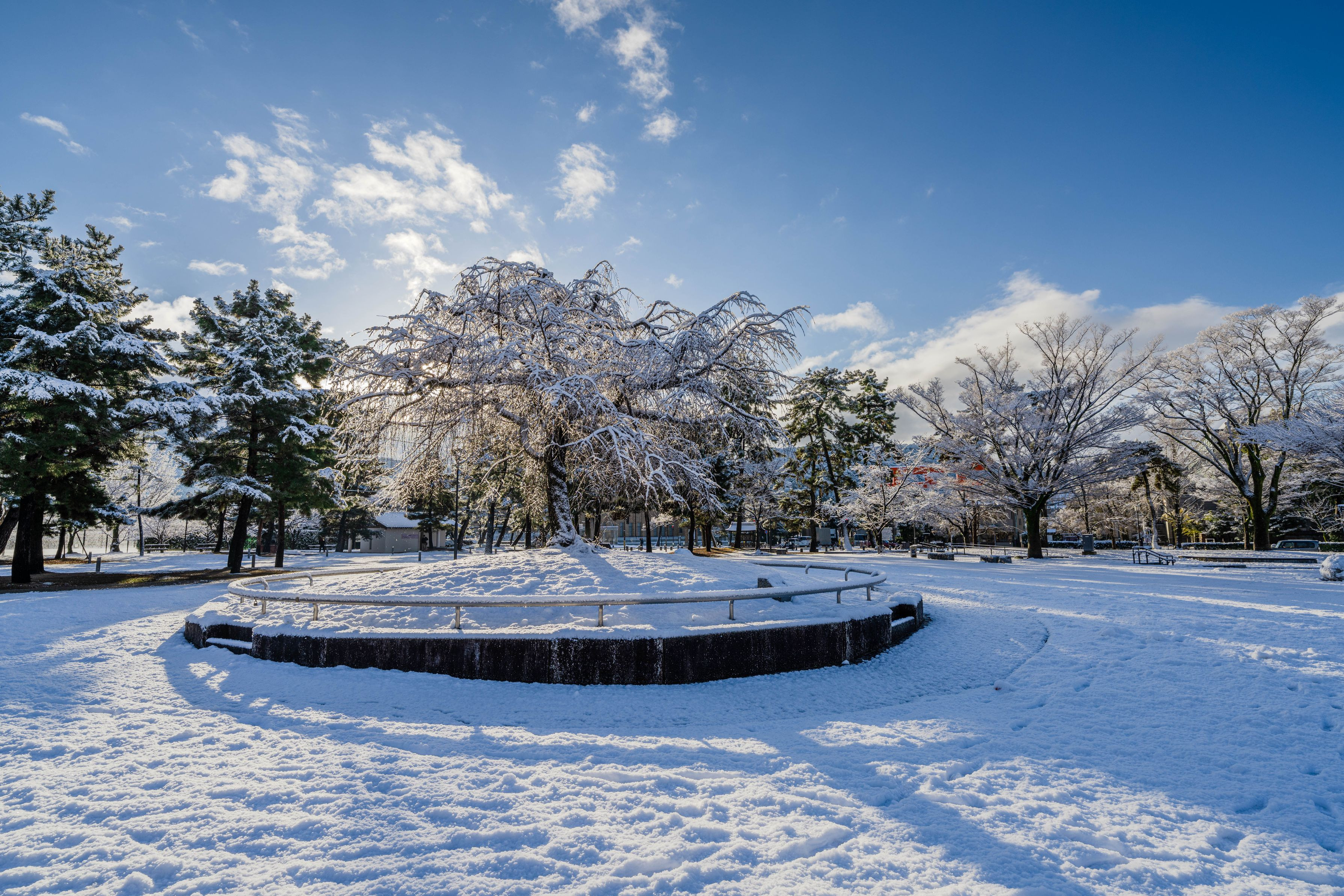 平安神宮前の岡崎公園の様子です。 この日は夜に降った雪で、白銀の世界でした。 春になると美しい姿の紅枝垂桜が違って見えました。
