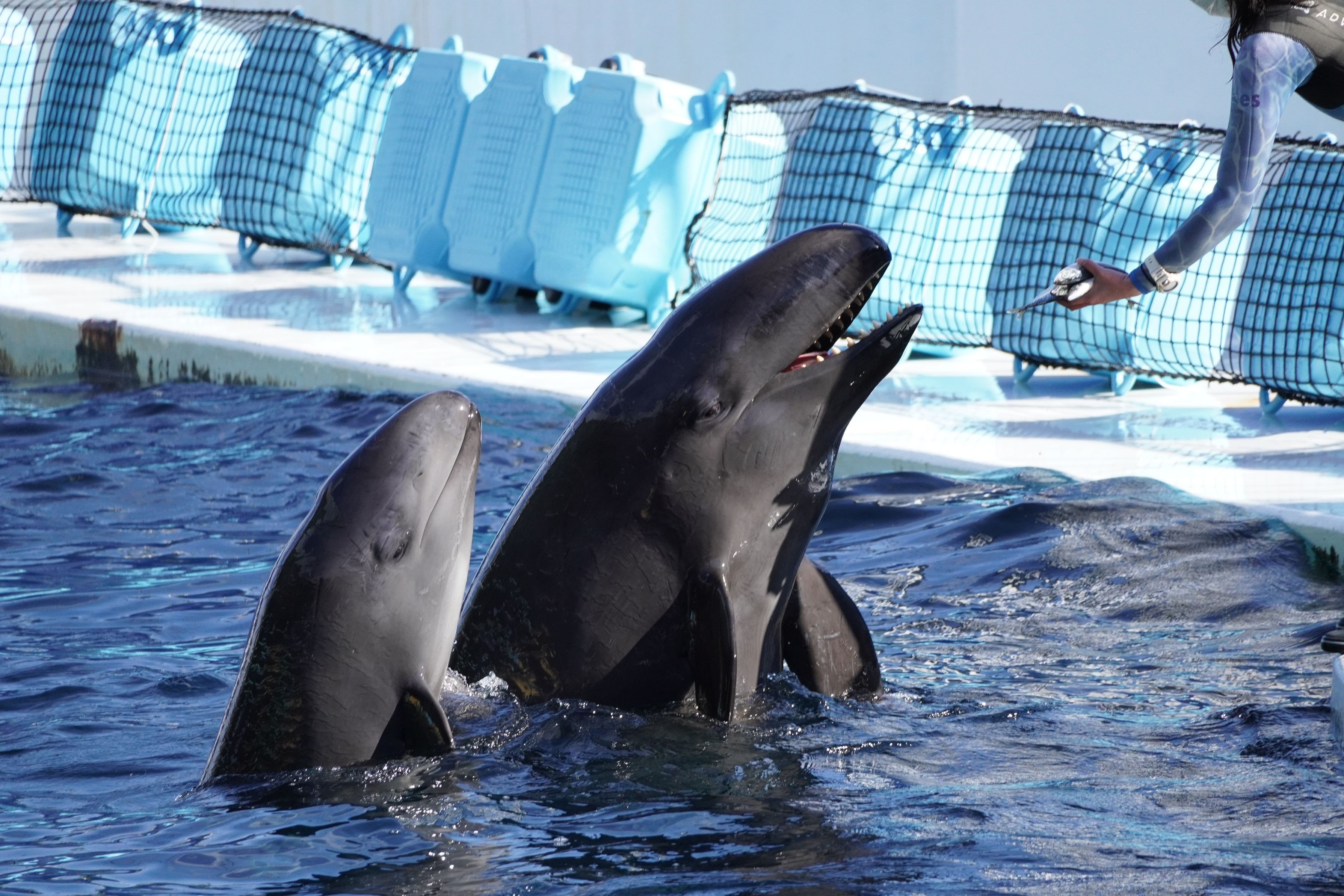 和歌山県のアドベンチャーワールドにて オキゴンドウ(クジラ)の親子が、トレーニングしながらお魚をもらって食べていました。