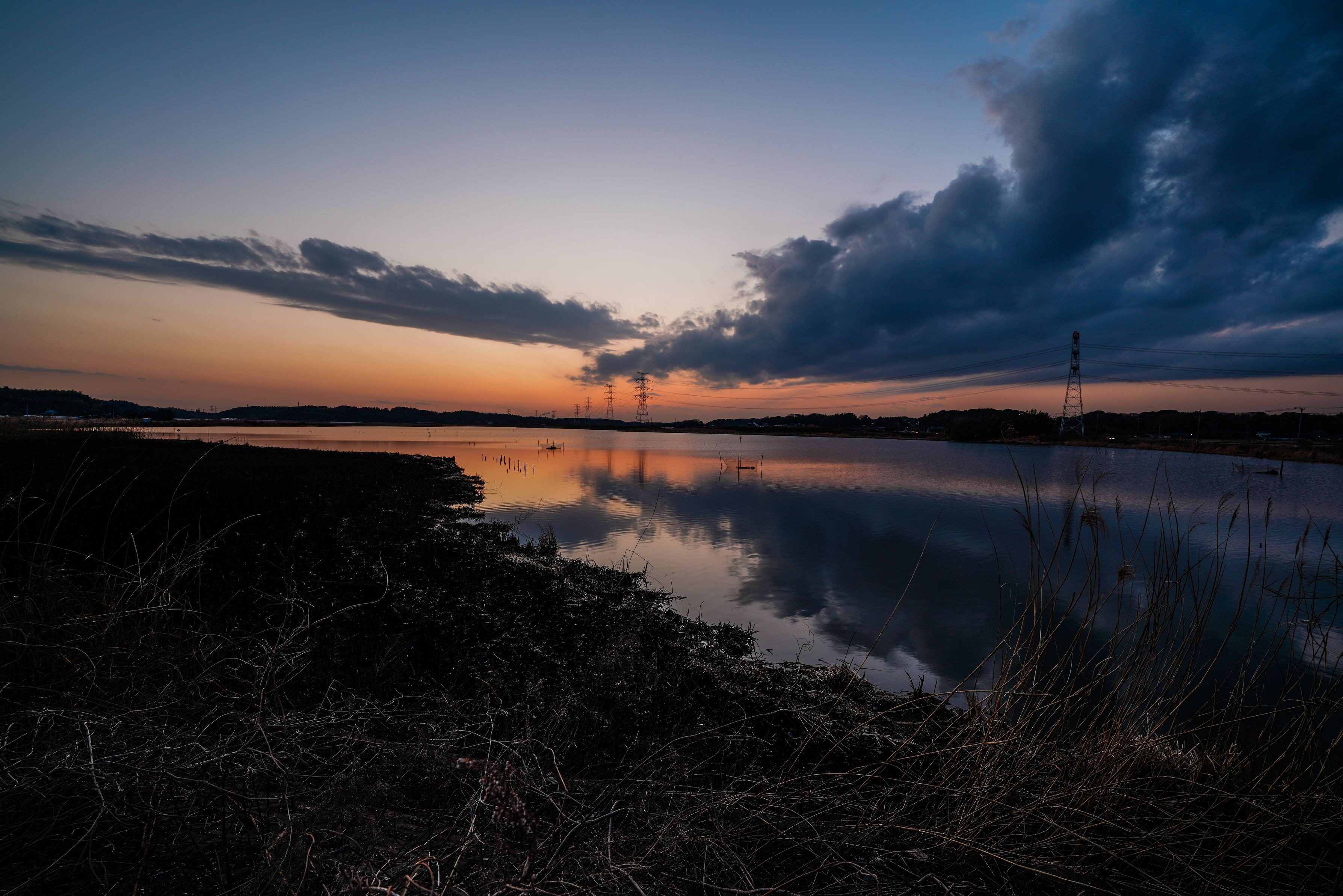 野焼きされた西手賀の夕景
