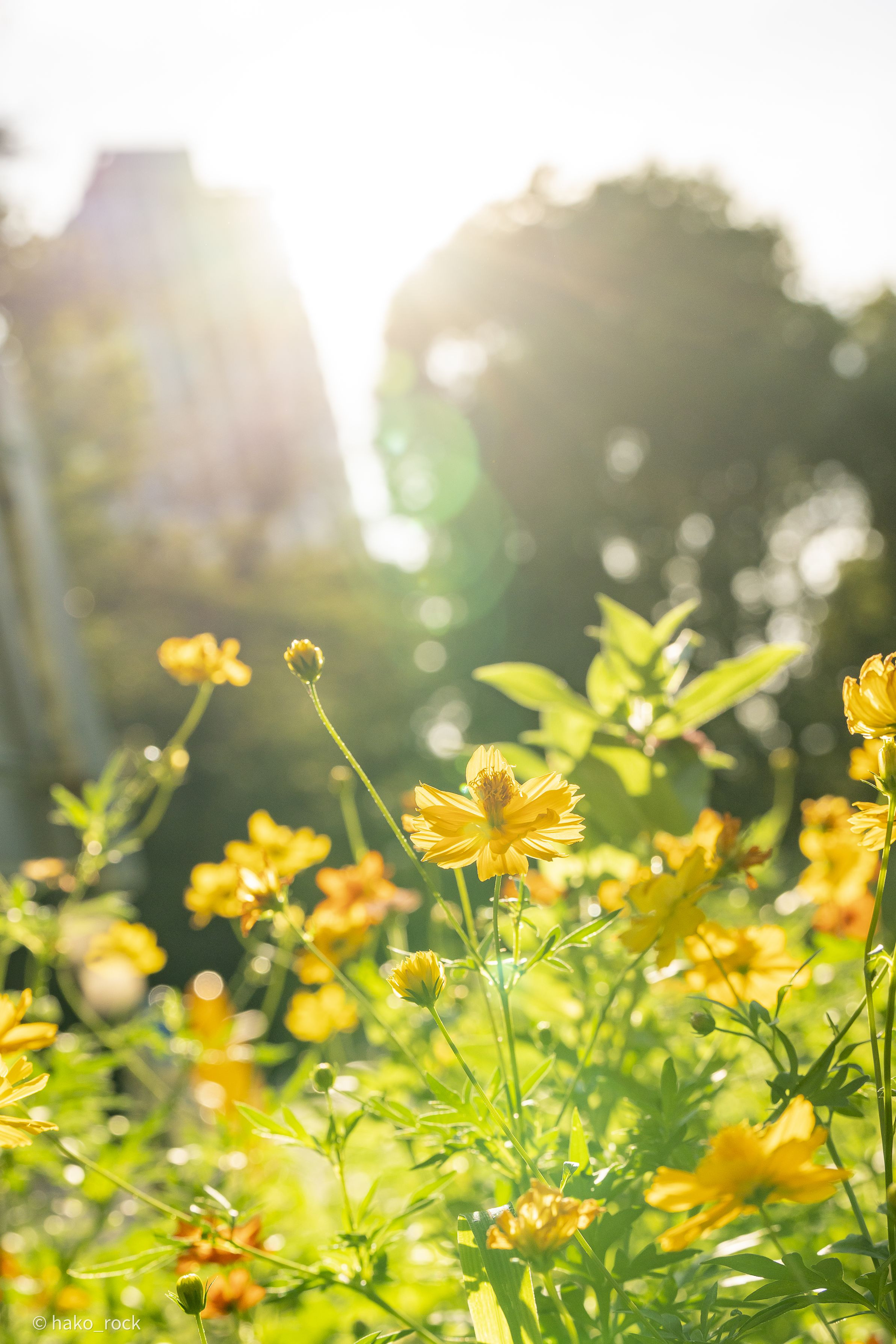 新宿にて、キバナコスモスとビルの隙間から見える太陽を撮りました
