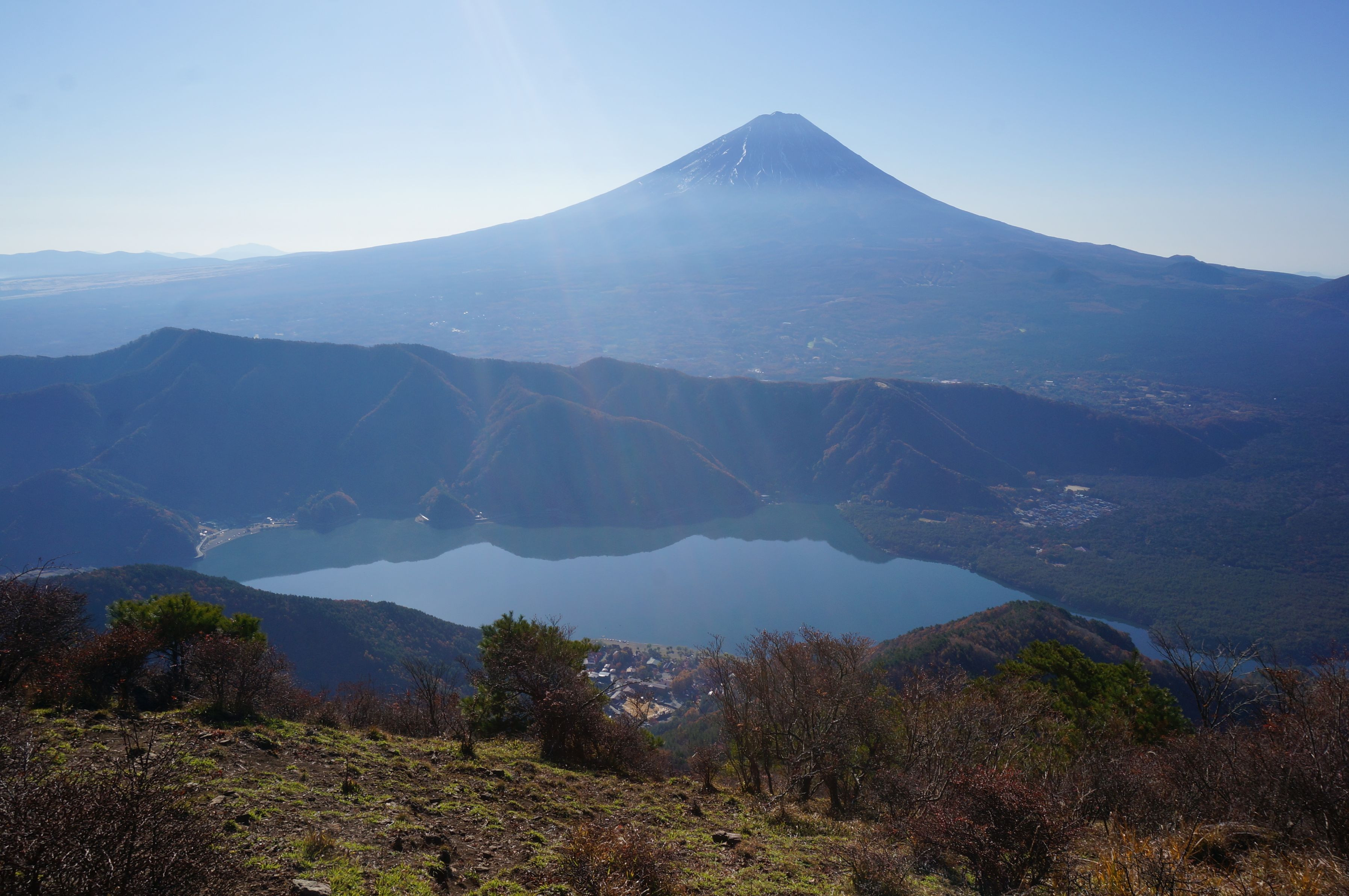 富士山に対して、西湖を挟んでの山から見た富士山です。