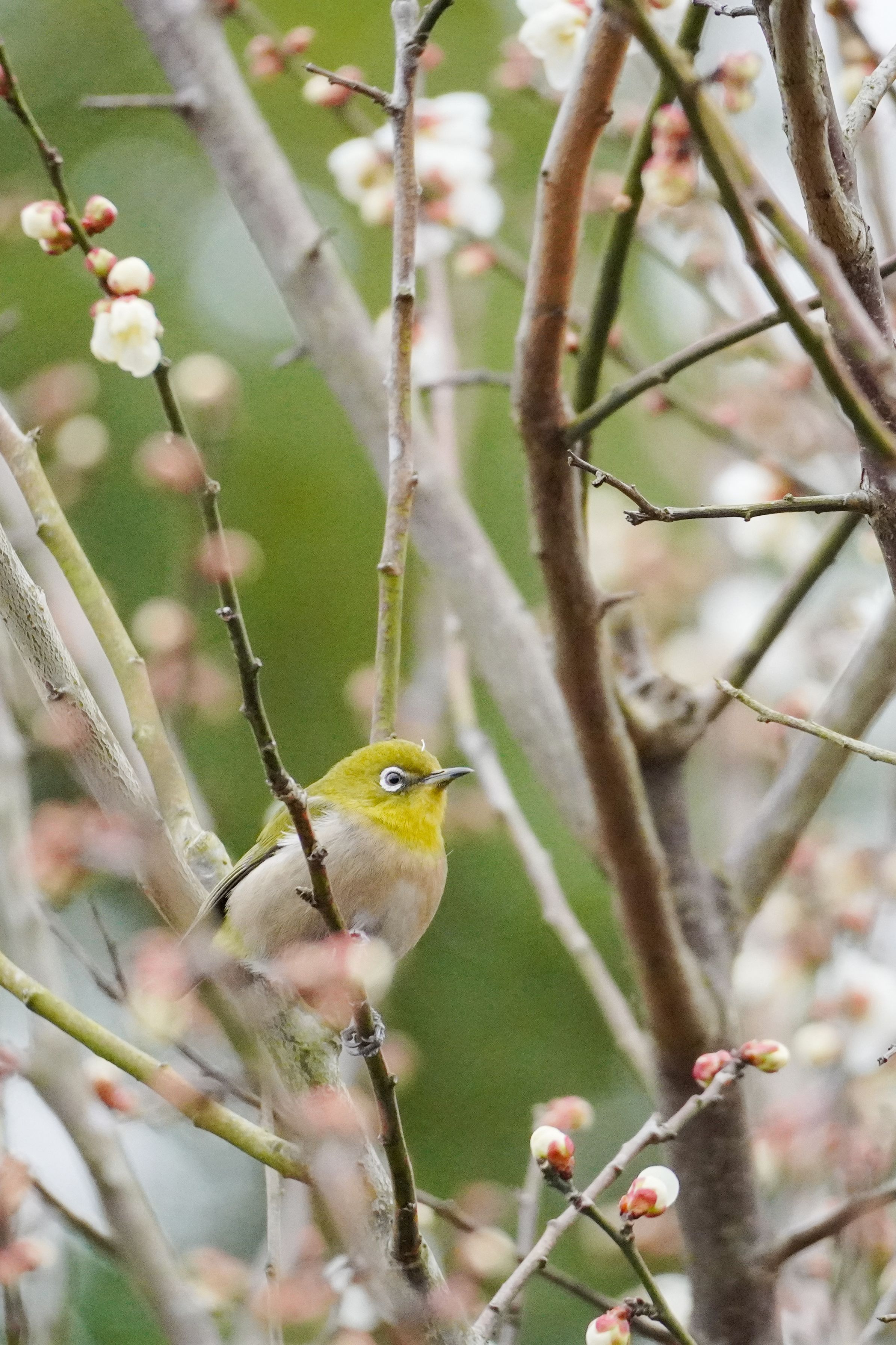 梅の花に夢中で警戒心のないメジロくん。 トリミングしています。