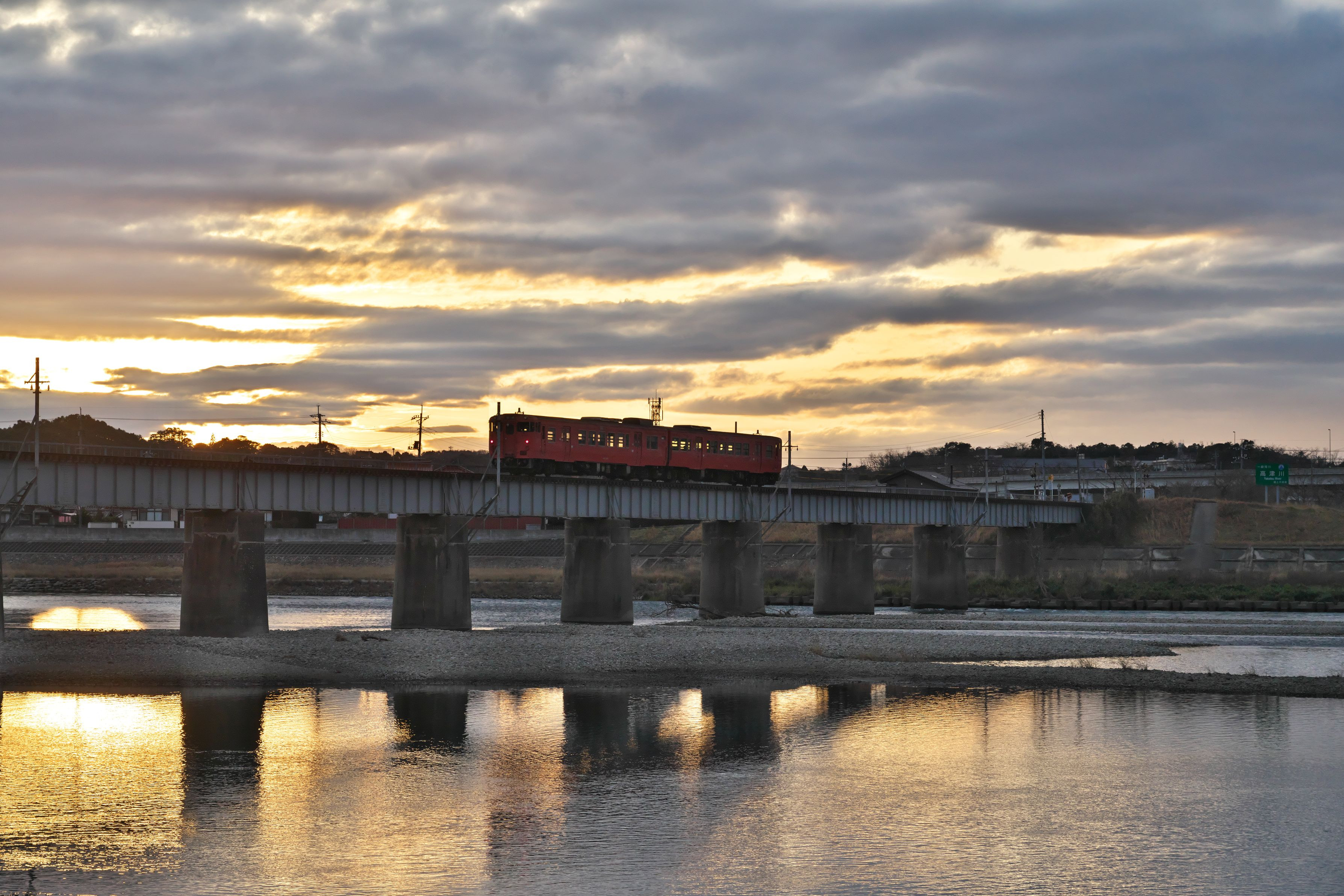 曇り空で、夕焼けは期待していなかったのですが、少し焼けてくれ、とてもよい雰囲気の夕景となりました。いつもの高津川橋梁と夕景と赤い列車です。#山陰本線#