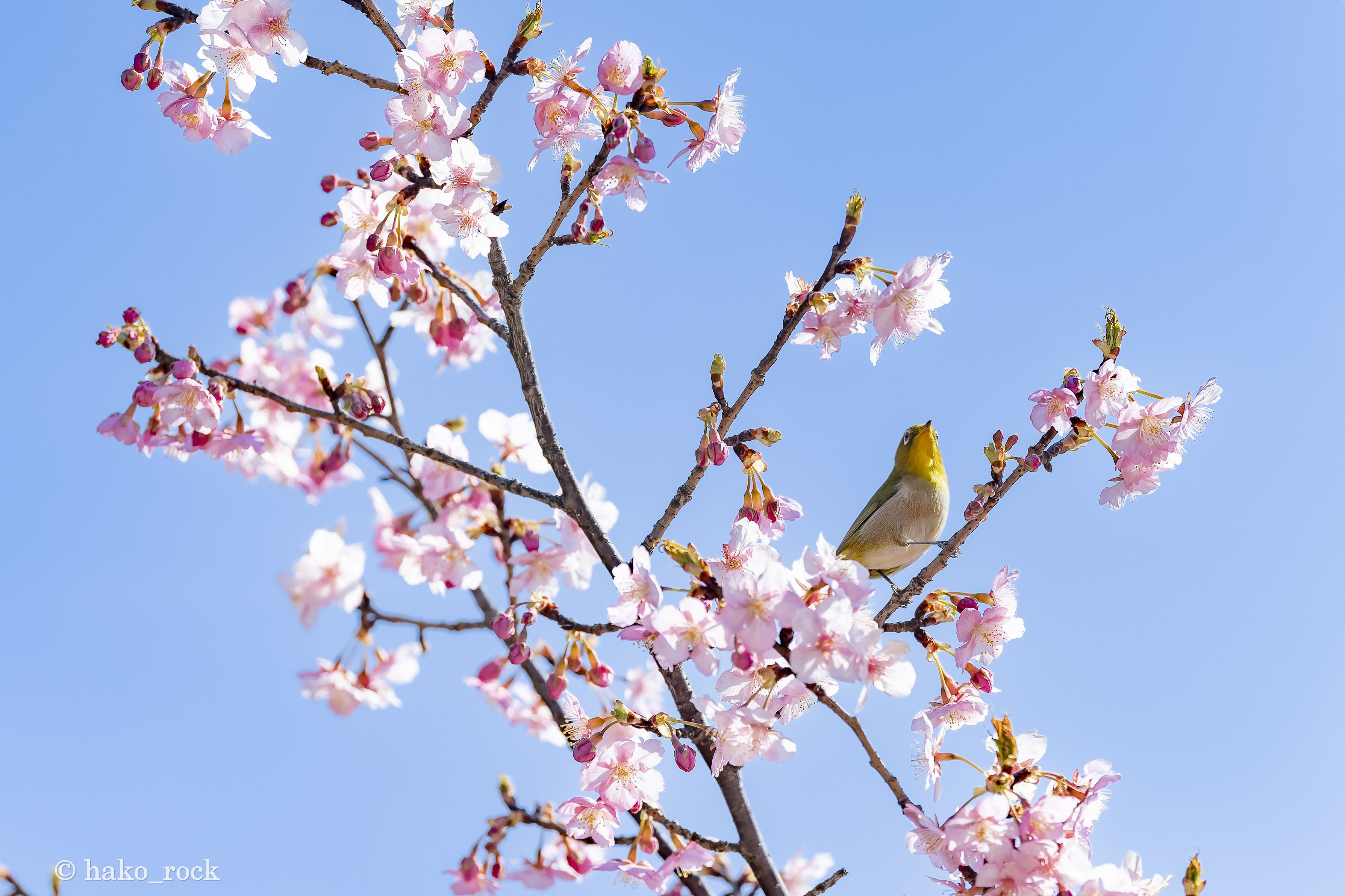 晴天の青色、河津桜の桃色、そしてメジロの黄色と緑色 春に向けて見える色彩も華やかになってきました。
