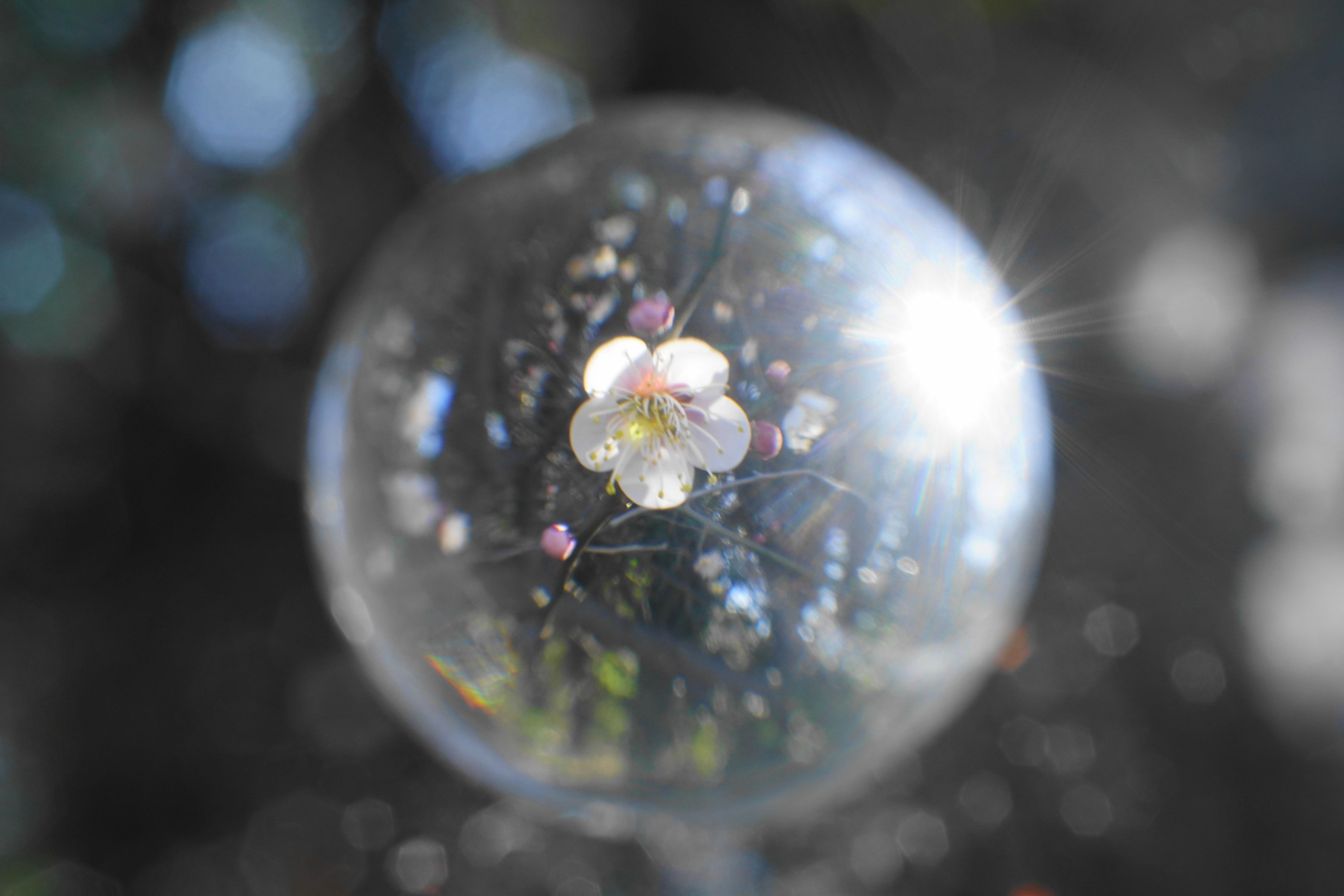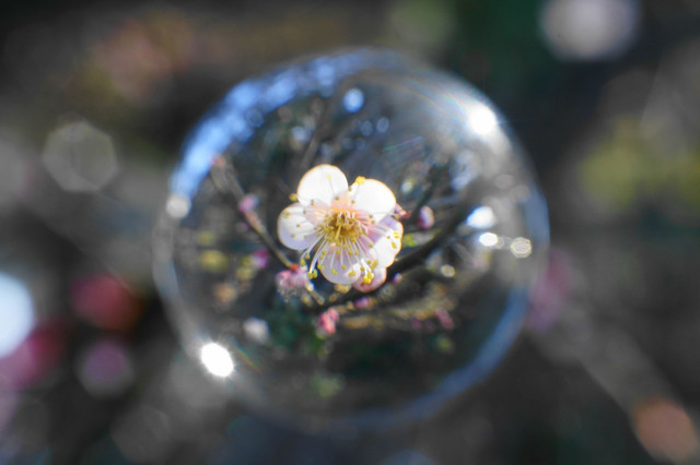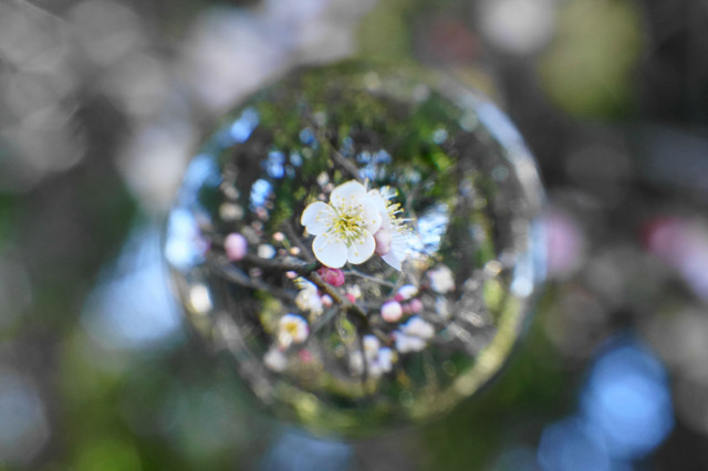 近所の梅が満開になり、近くの枝にも花が咲いてくれたので、30ミリマクロの出番だと思い、梅の花を宙玉に入れてみました。(#^.^#)