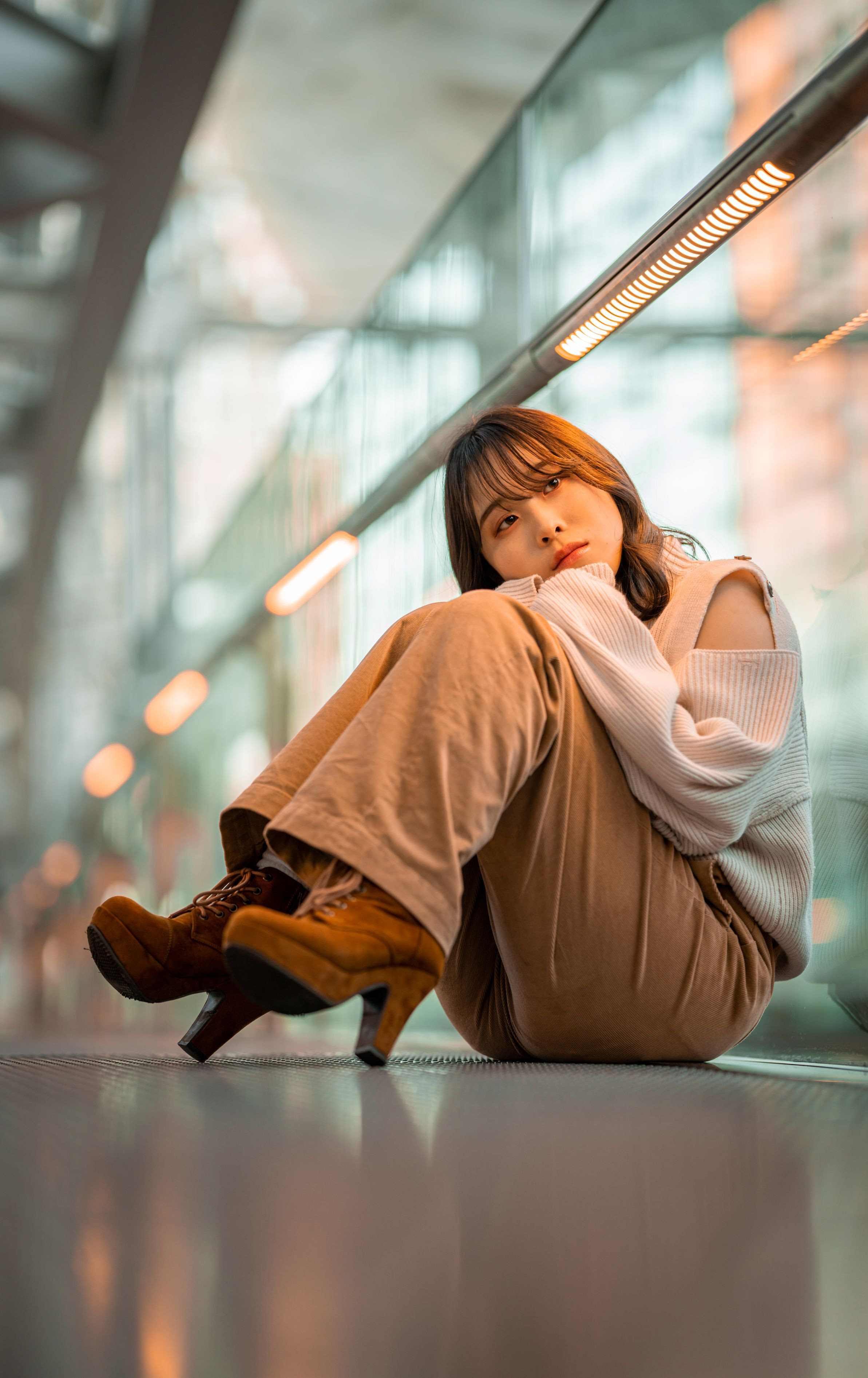 東京国際フォーラムで友人を撮影。 大きいガラスの感じとダウンライトの暖色を出してみました。
