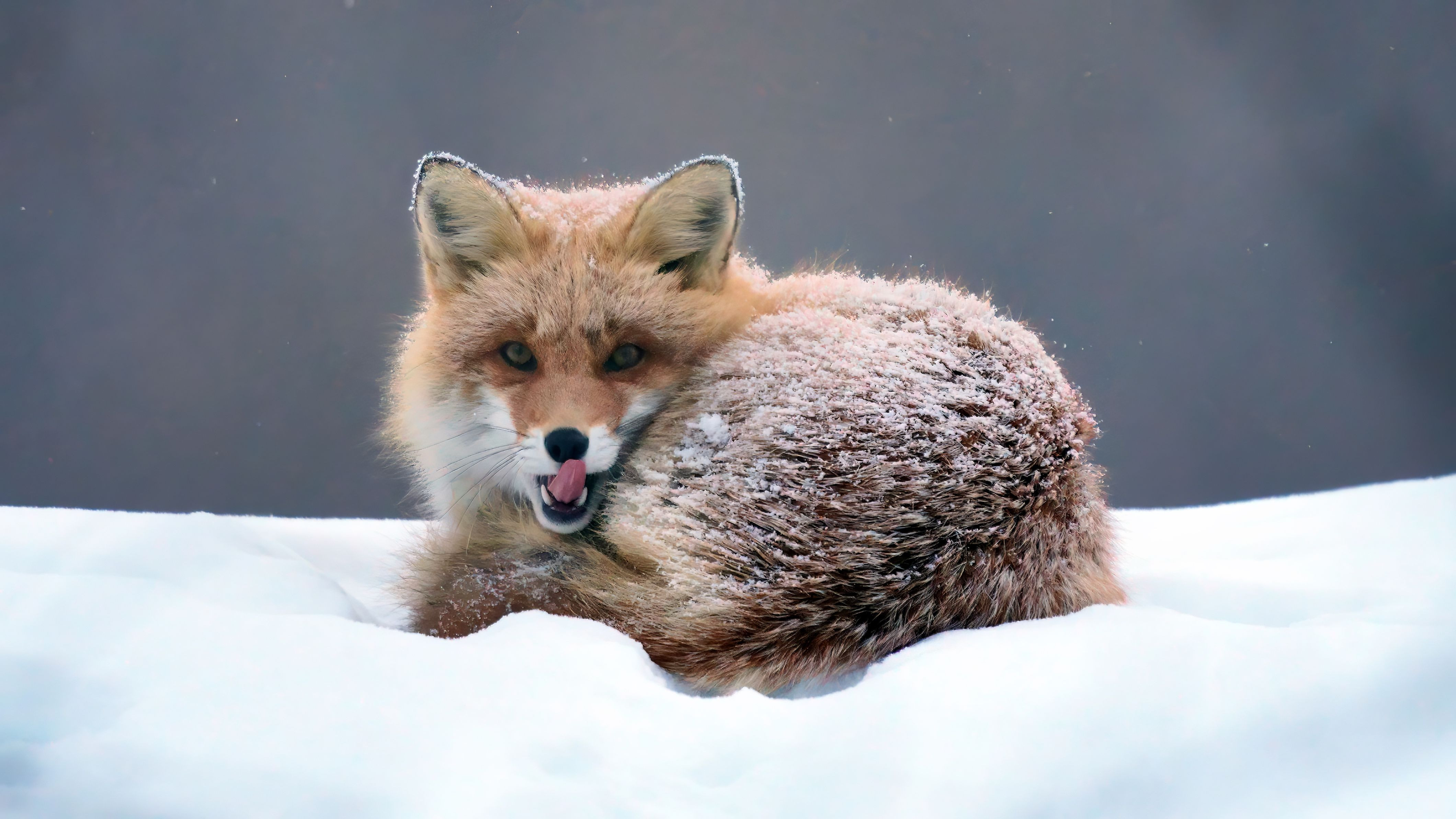木が生い茂った部分でキタキツネが1匹丸まって寝ていました。 静かにカメラを用意し、そっとシャッターを切ると目をあけたキツネがこちらを見ながら舌をペロリ。体にかかったパウダースノーがドーナツにかかったお砂糖みたいでした。