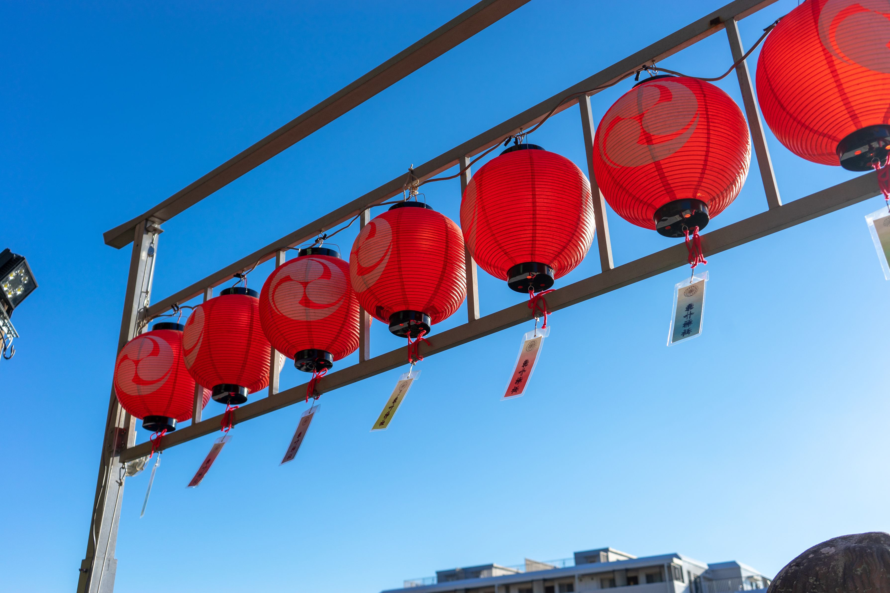 神社に行った際に赤い提灯と青空のコントラストがキレイだったので撮影しました。