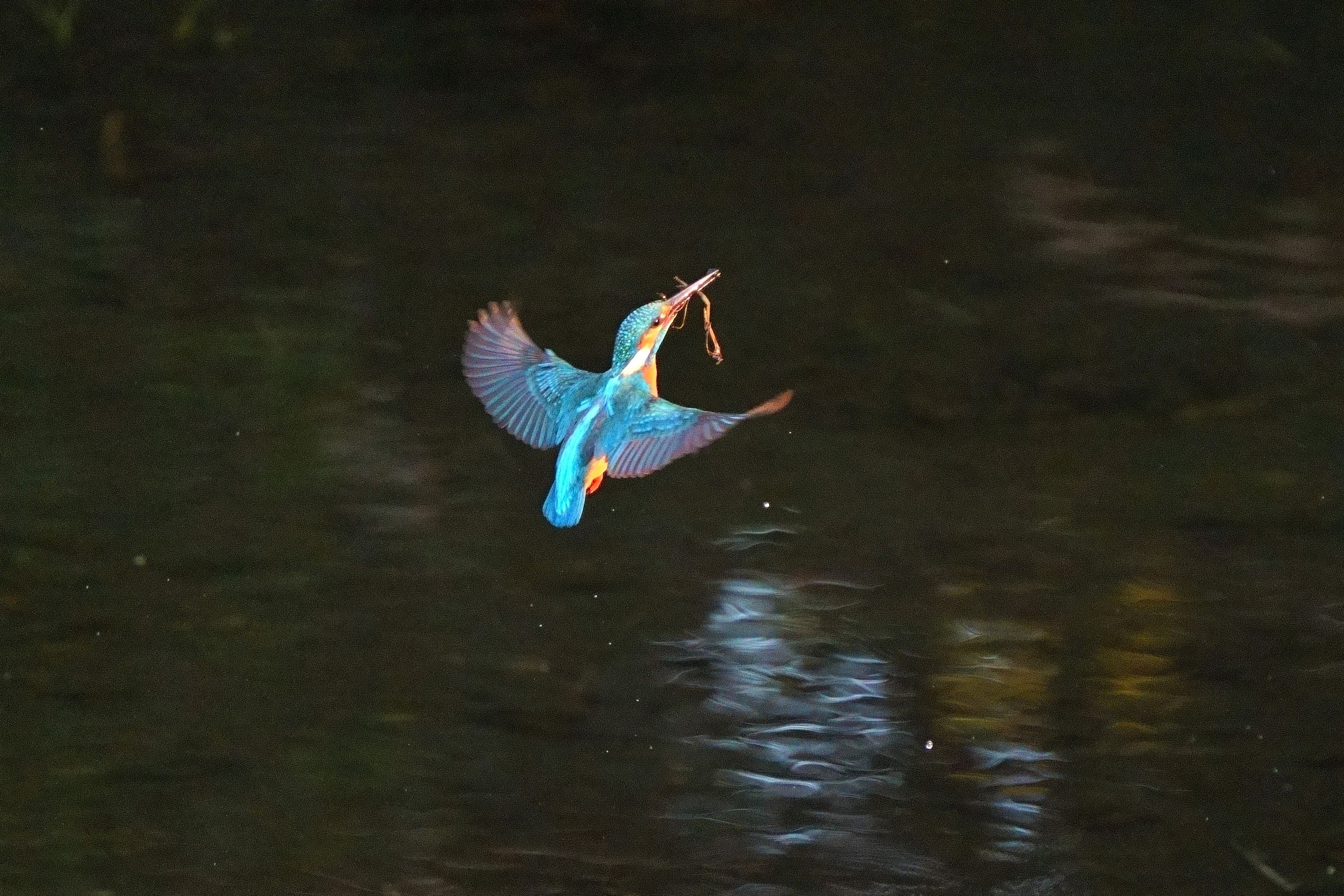 夕陽を受けて、枝を咥えて飛ぶカワセミ(お豆切れです)