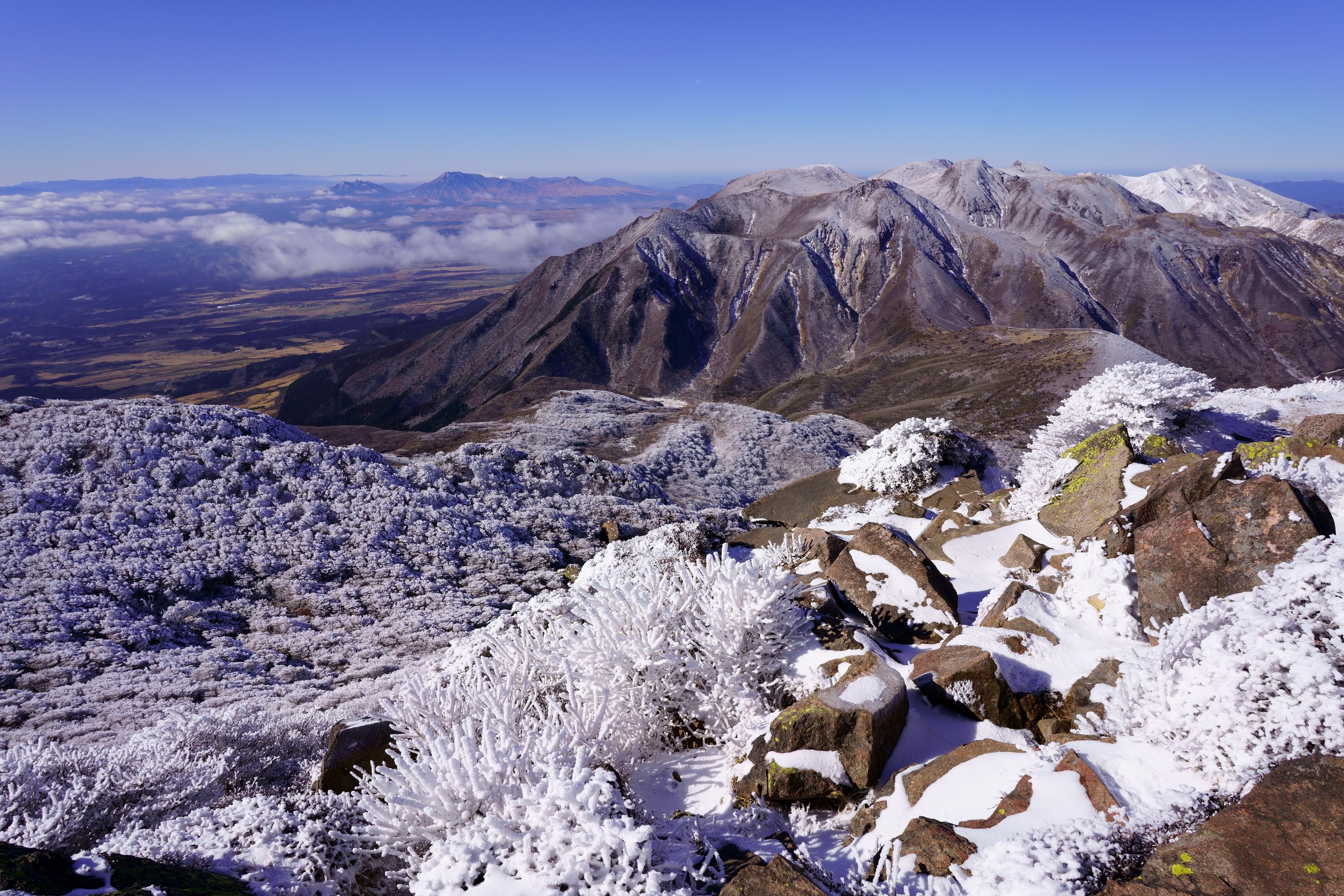 大船山から360度ビューで、周りの山々もきれいに見えました。そして、大船山の御池あたりの樹氷が、モリモリと真っ白でとても美しかった。