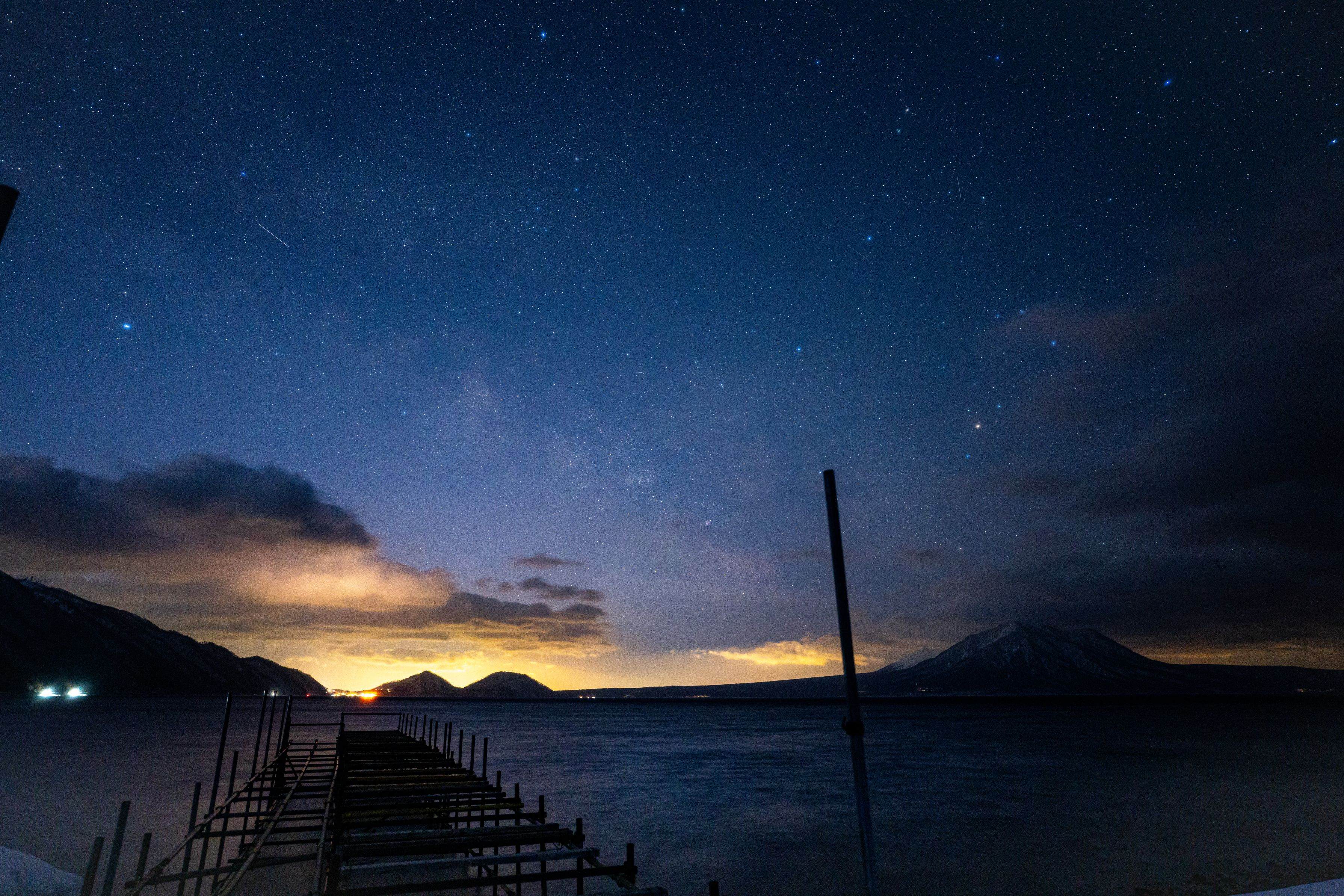 この日は北海道のこの時期としてとても暖かく4℃。頭上は星が輝いていましたが、撮影方向には雲が多く、雪の上に寝転がりながら星を眺め、雲が過ぎゆくのを静かに待っていた。 遠く千歳方面の灯が雲に反射してします。