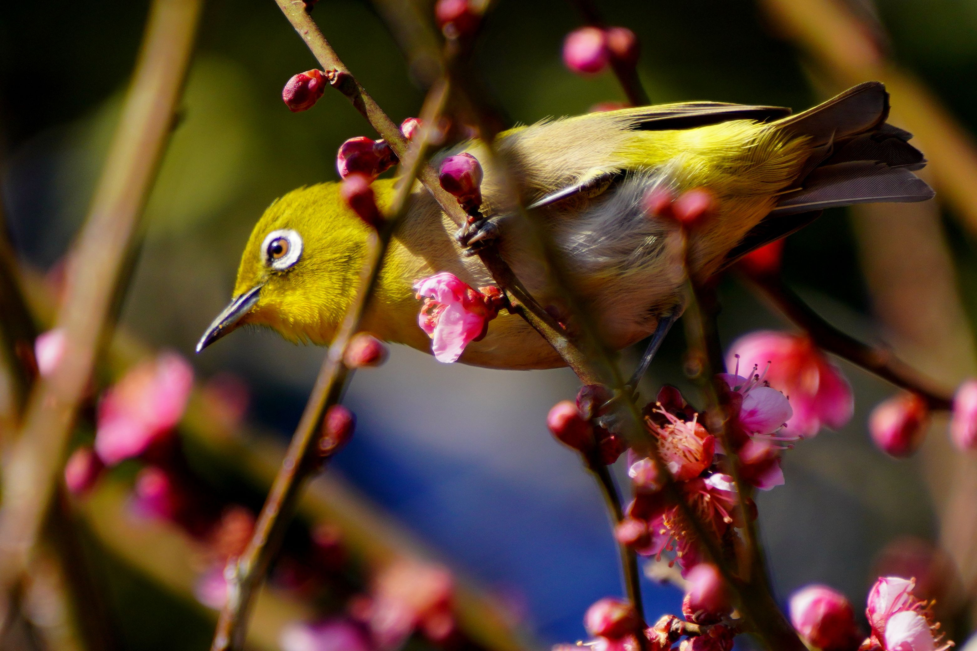 梅の木周りにカメラマンの団体がレンズはすべて同じ方向へ・・ なんだ メジロか あまり興味もないので2-3枚写してからてから次はと でも鳥を追いかけるのが 新型ほど性能がいいな さすがソニー