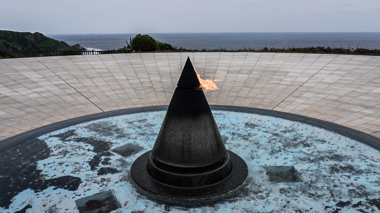 この「平和の火」は、沖縄戦最初の米軍の上陸地である座間味村阿嘉島において採取した火と被爆地広島市の「平和の灯」及び長崎市の「誓いの火」から分けていただいた火を合火し、1991年から灯し続けた火を1995年6月23日の「慰霊の日」にここに移し、灯したものです。 海の表情が平和を連想させない現状の世界と照らし合わされ、さらなる平和への念を強くしています。