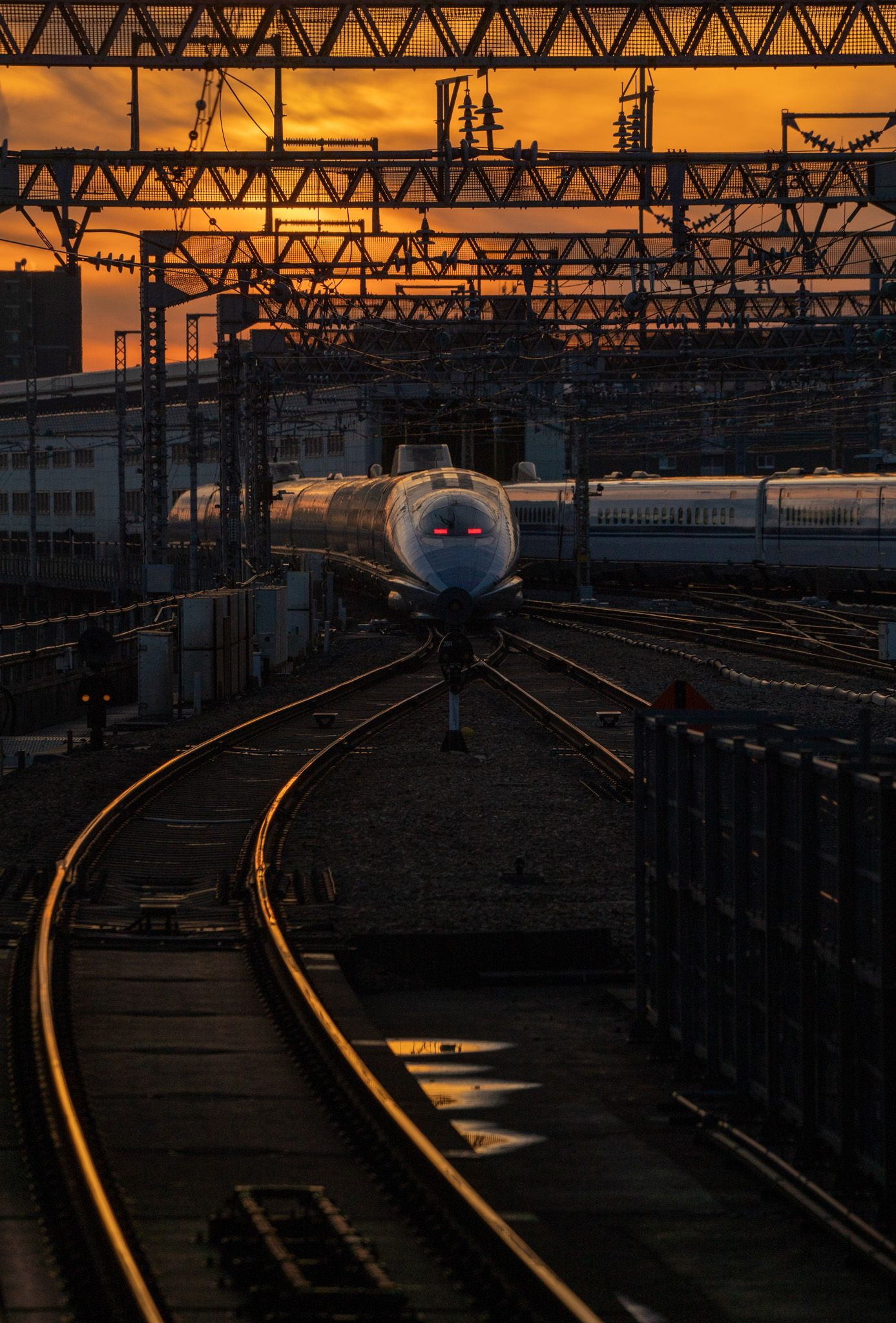 夕焼けに向かって新大阪駅を発車した500系