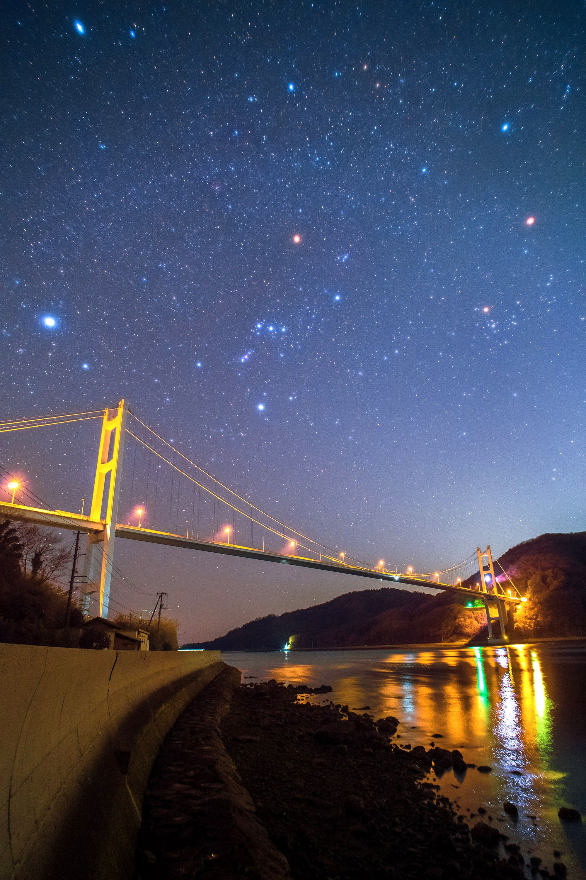 瀬戸内海とびしま海道の豊島大橋の上にオリオンが昇っていました。橋を渡っていくかのような情景が美しくて印象的でした。