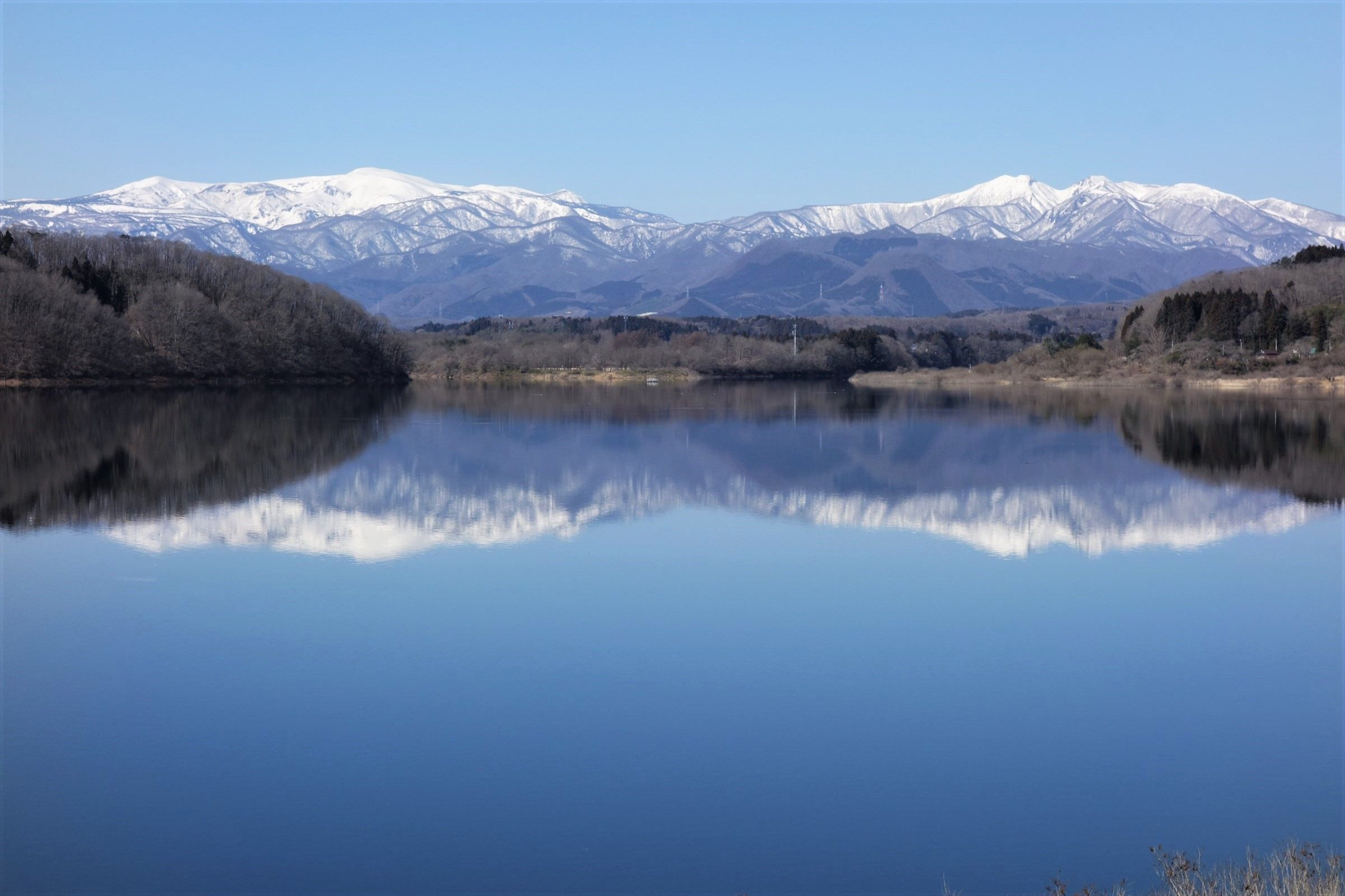 蔵王連峰と凪の釜房湖