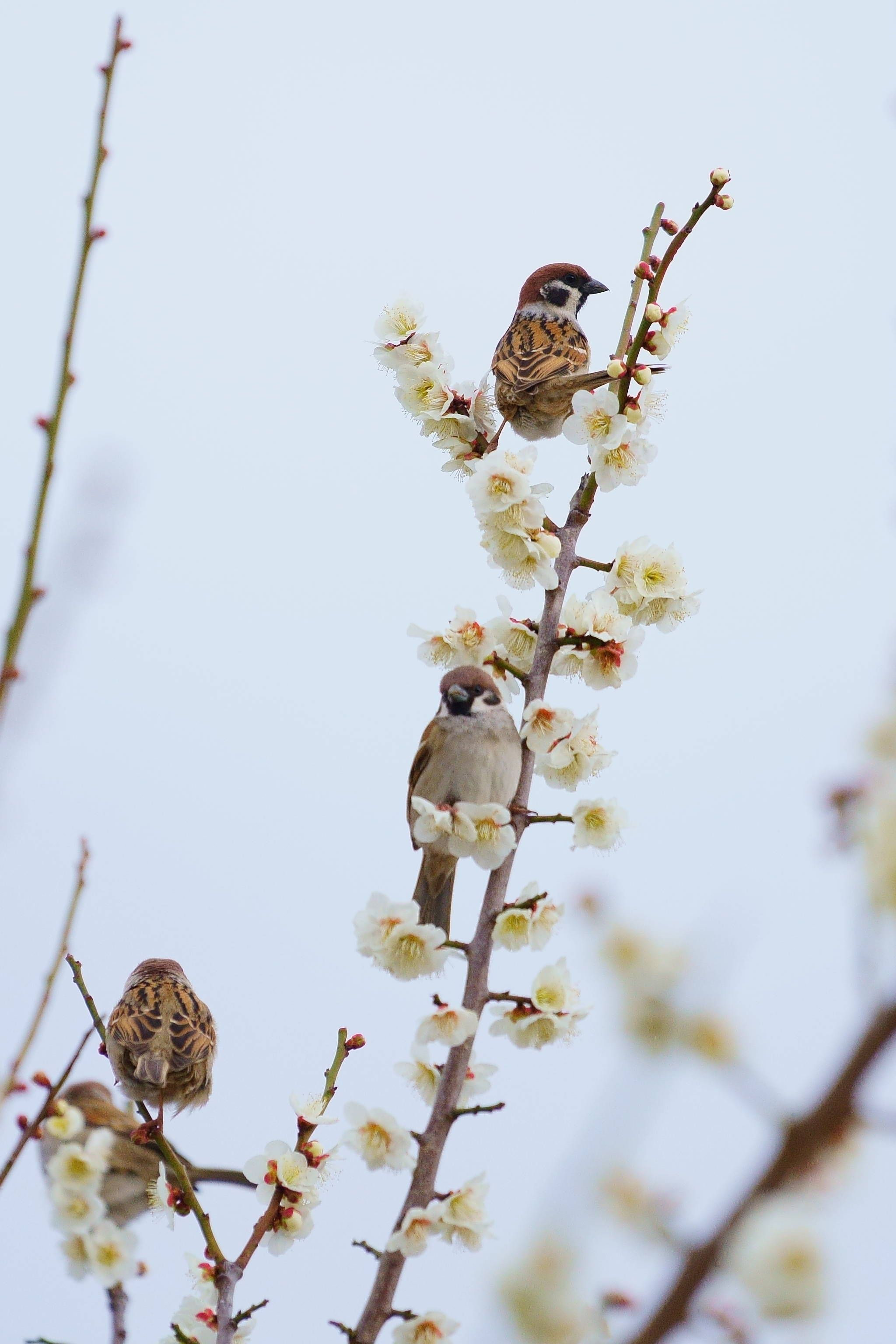 白梅にとまるすずめたちでした