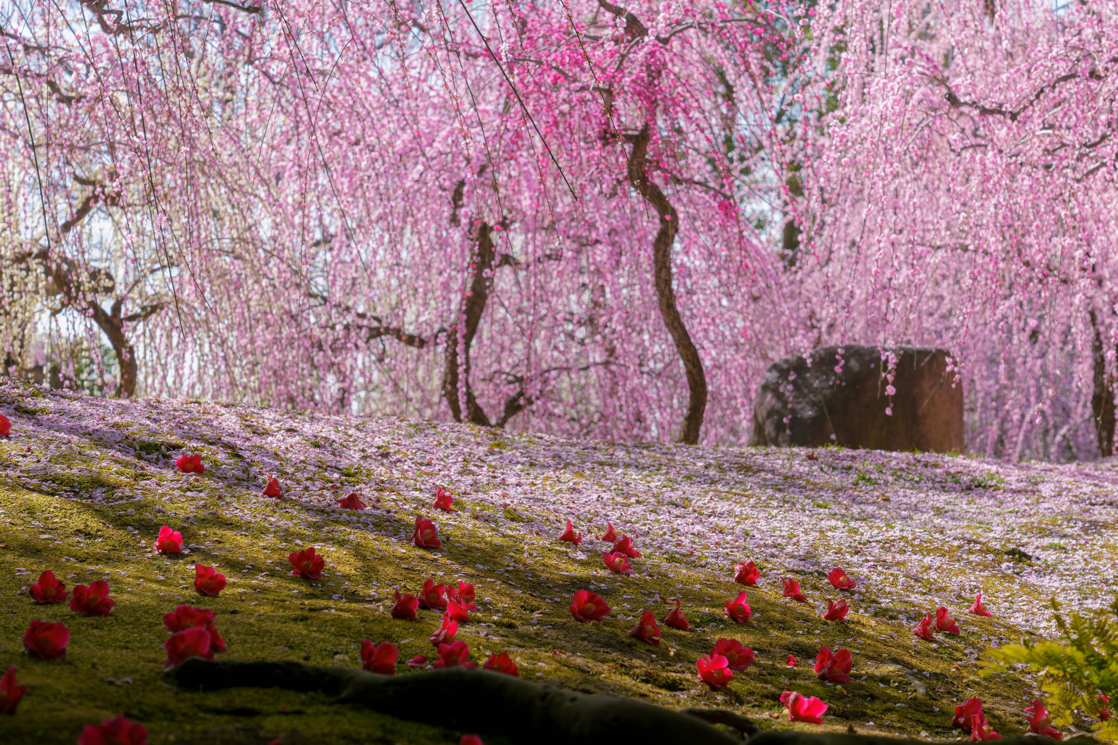 城南宮の枝垂れ梅と椿。すごい人でした。有名な写真構図の場所はさらにすごい人でした。