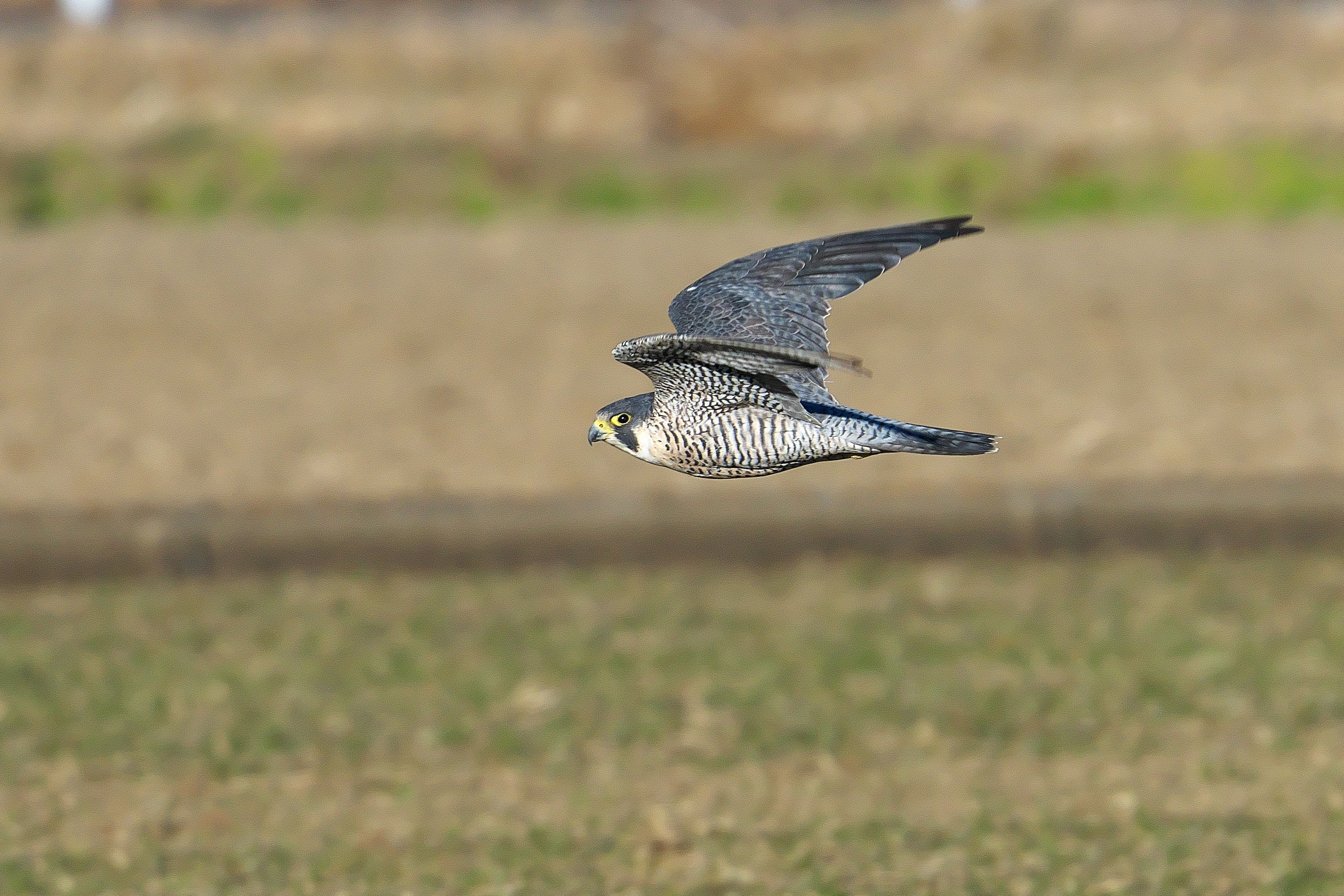 被写体との距離は30m程度です。 ハヤブサと目が合って、こちらを見ながら飛んでいます。意外と被写体がこちらをみて目が合う?ことがあります。鳥からもよく見えているのです。撮影は静かに目立たないようする事は大切ですね。