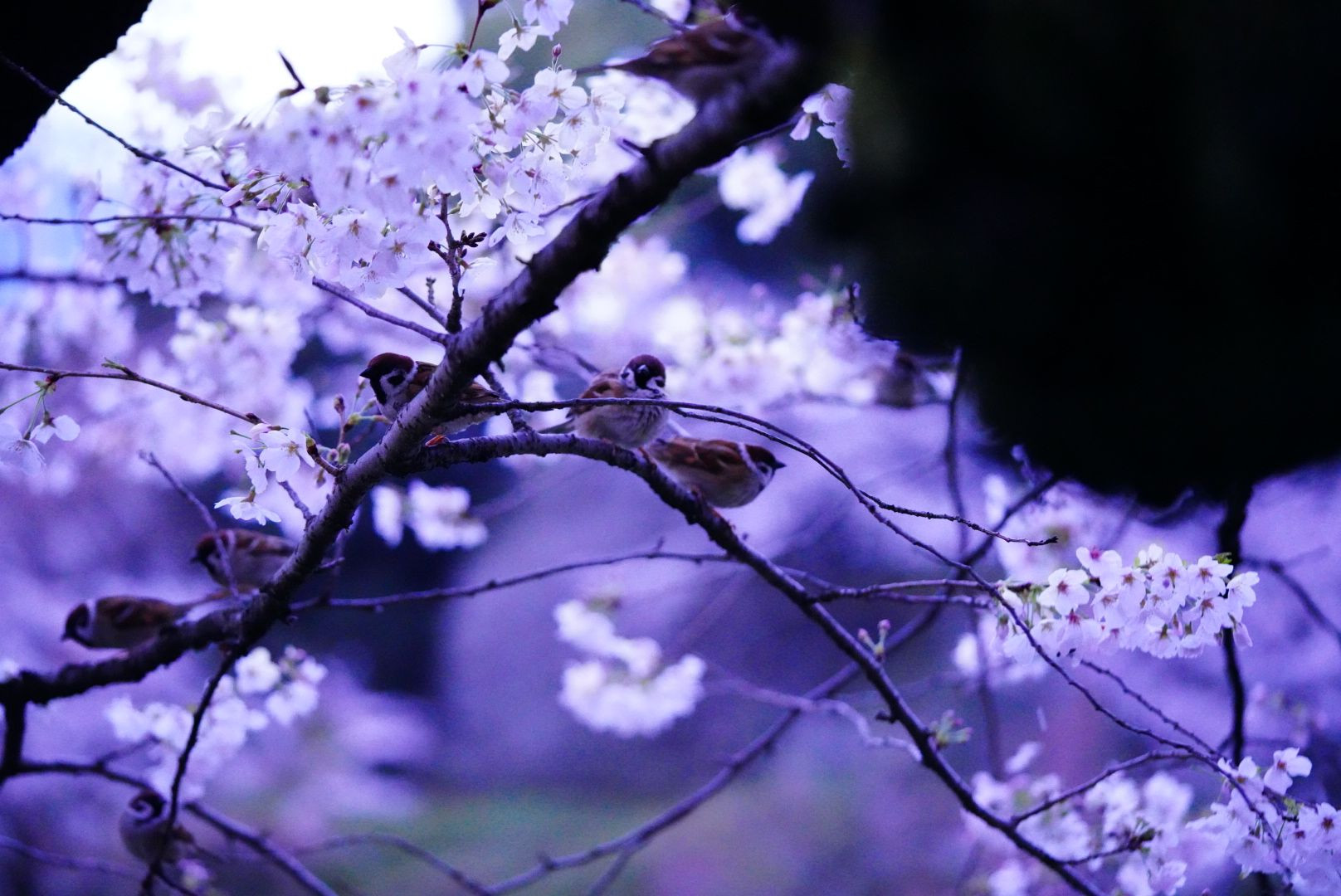 千鳥ヶ淵でライトアップ前の夕暮れ時、沢山のスズメが飛んできました。 桜の枝がまるで窓枠のよう。