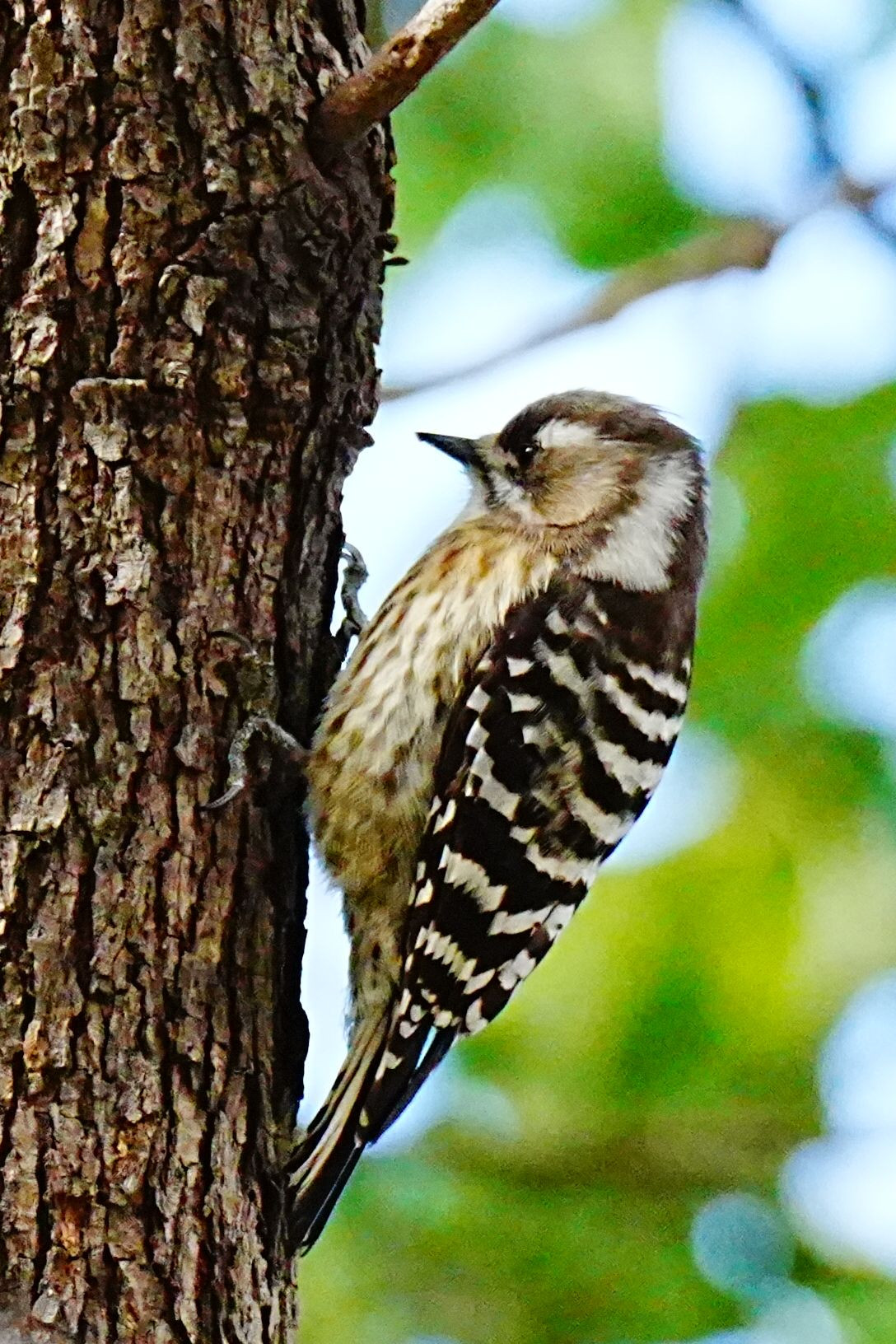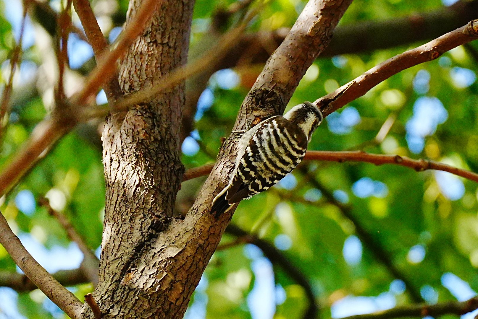 コンコン木を叩く音が聞こえたので、上を見上げるとコゲラちゃんが木を叩いていました。とっても高い木だったので枝や葉で姿を捉えるのが難しかったです。
