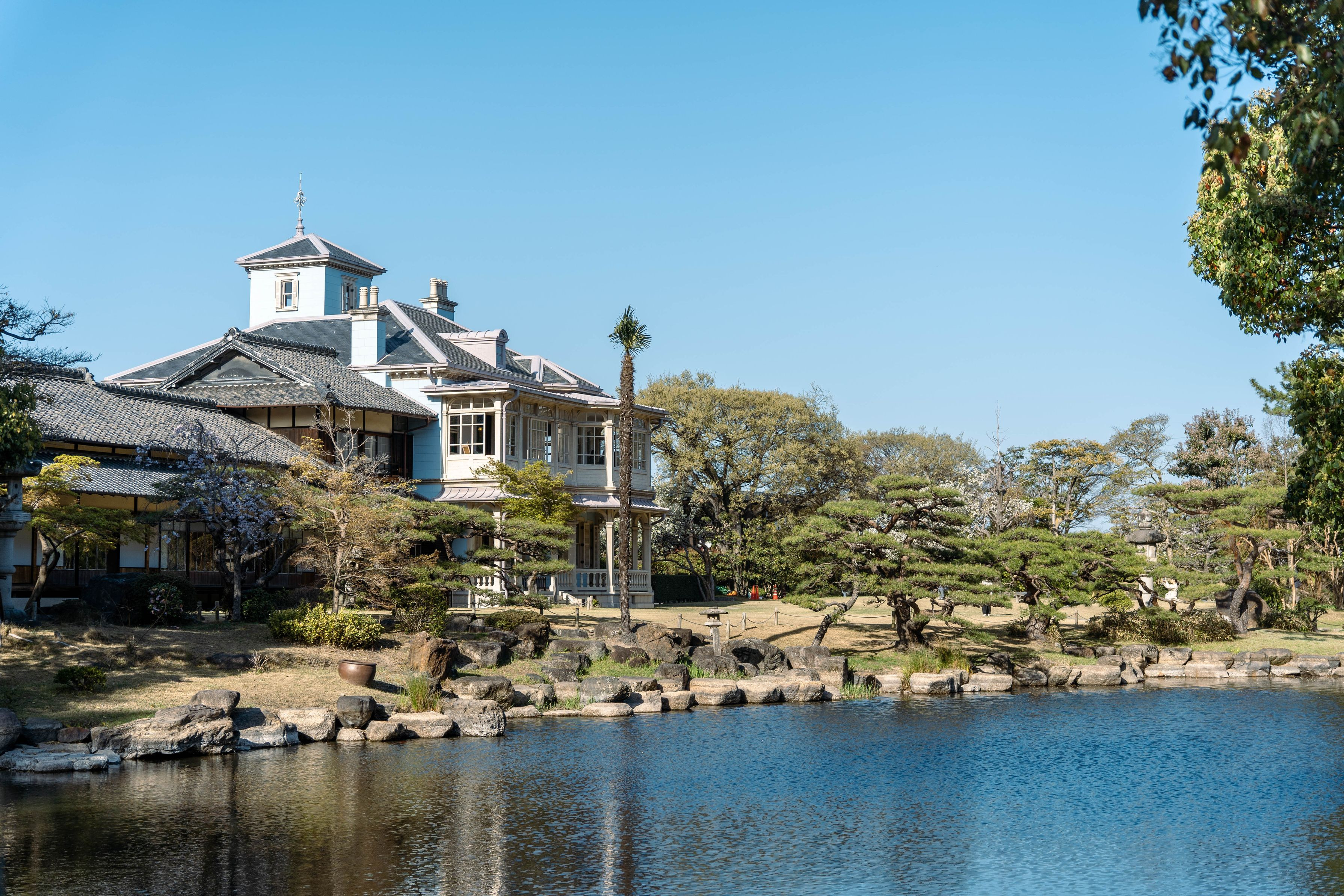 桑名の六華苑に行ってきました。山林王の豪華な和洋折衷邸宅です。洋館部分は鹿鳴館などを手掛けたジョサイア・コンドル。関東以外で彼設計の建物が見れるのはここだけ。 天気がものすごくよかったです。