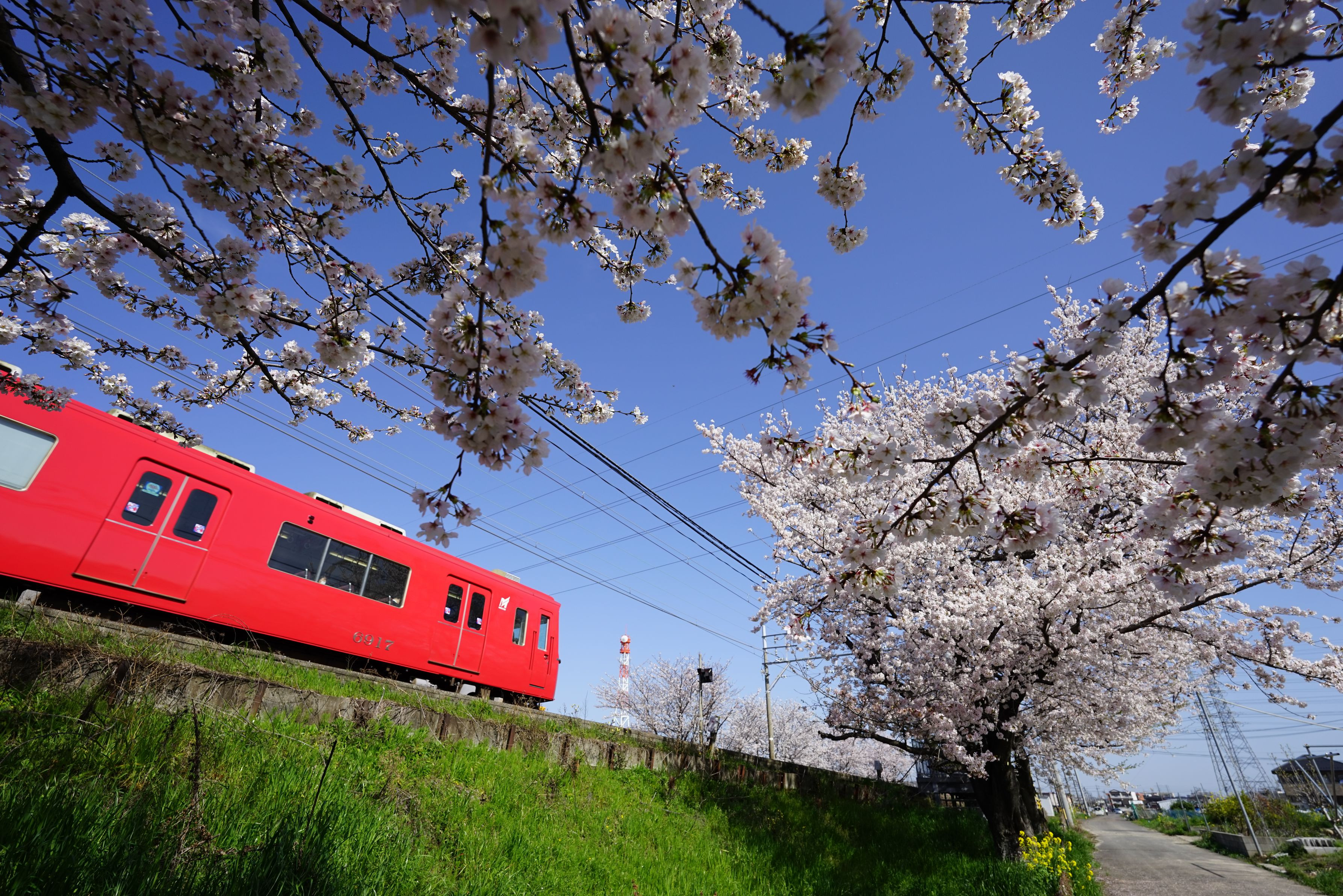 岩倉市を流れる五条川沿いの桜並木と、名鉄電車を入れて撮影しました。