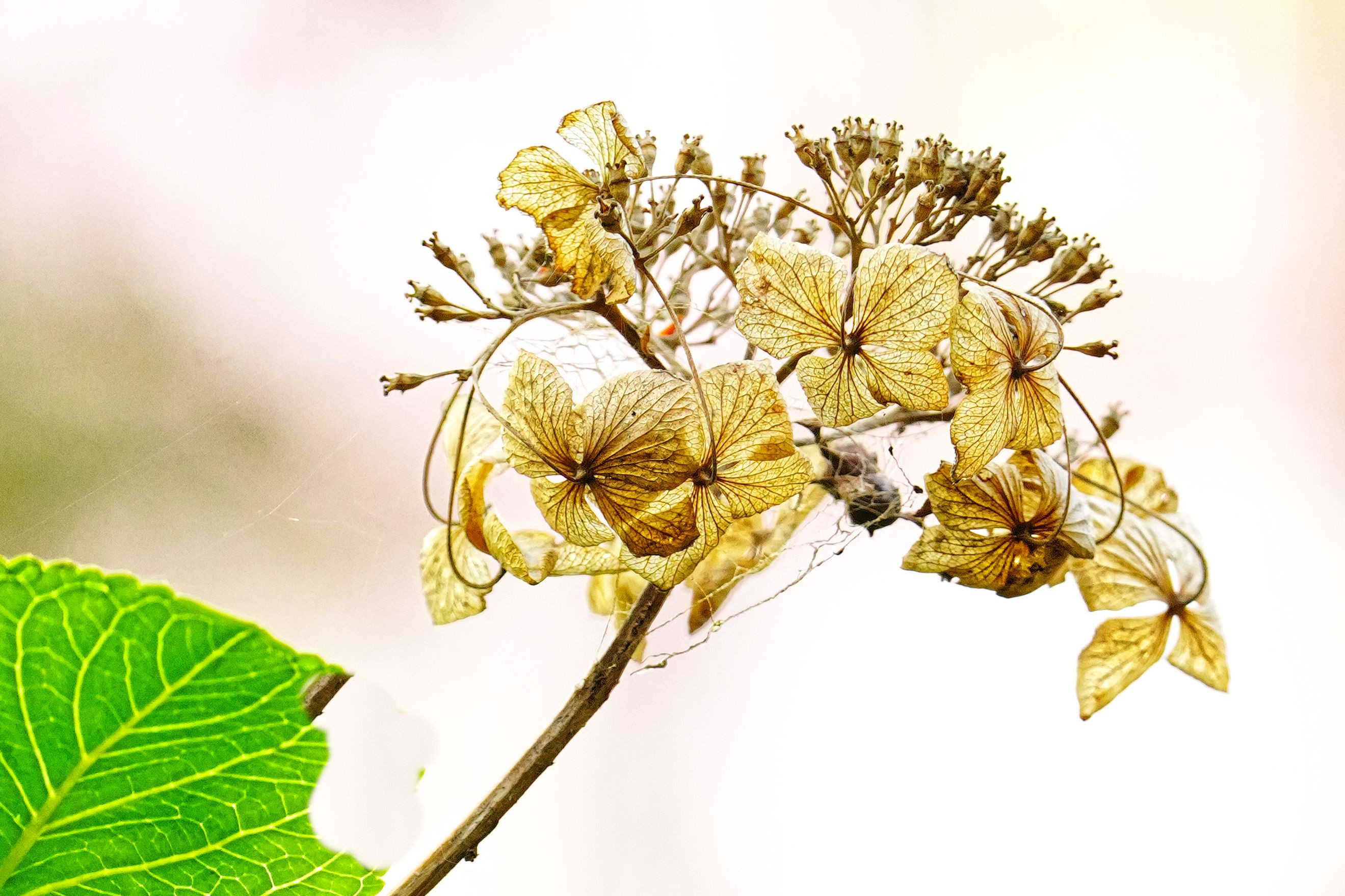 あじさいは花が終わった後は花茎を剪定するのですが、放ったらかしのものを探しては周年撮影しています。冬の枯れた模様に緑が加わり、逆光に映えていました。