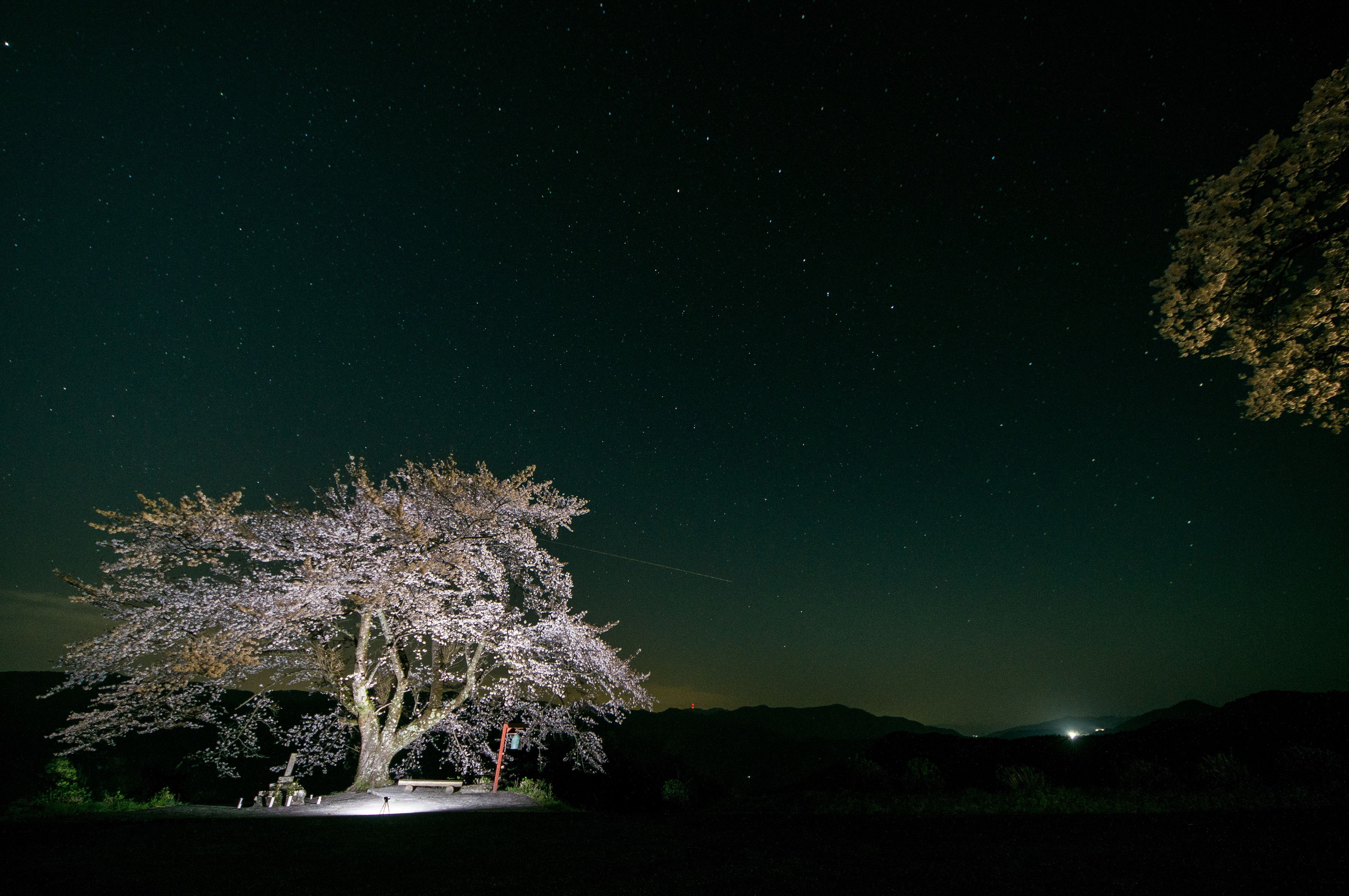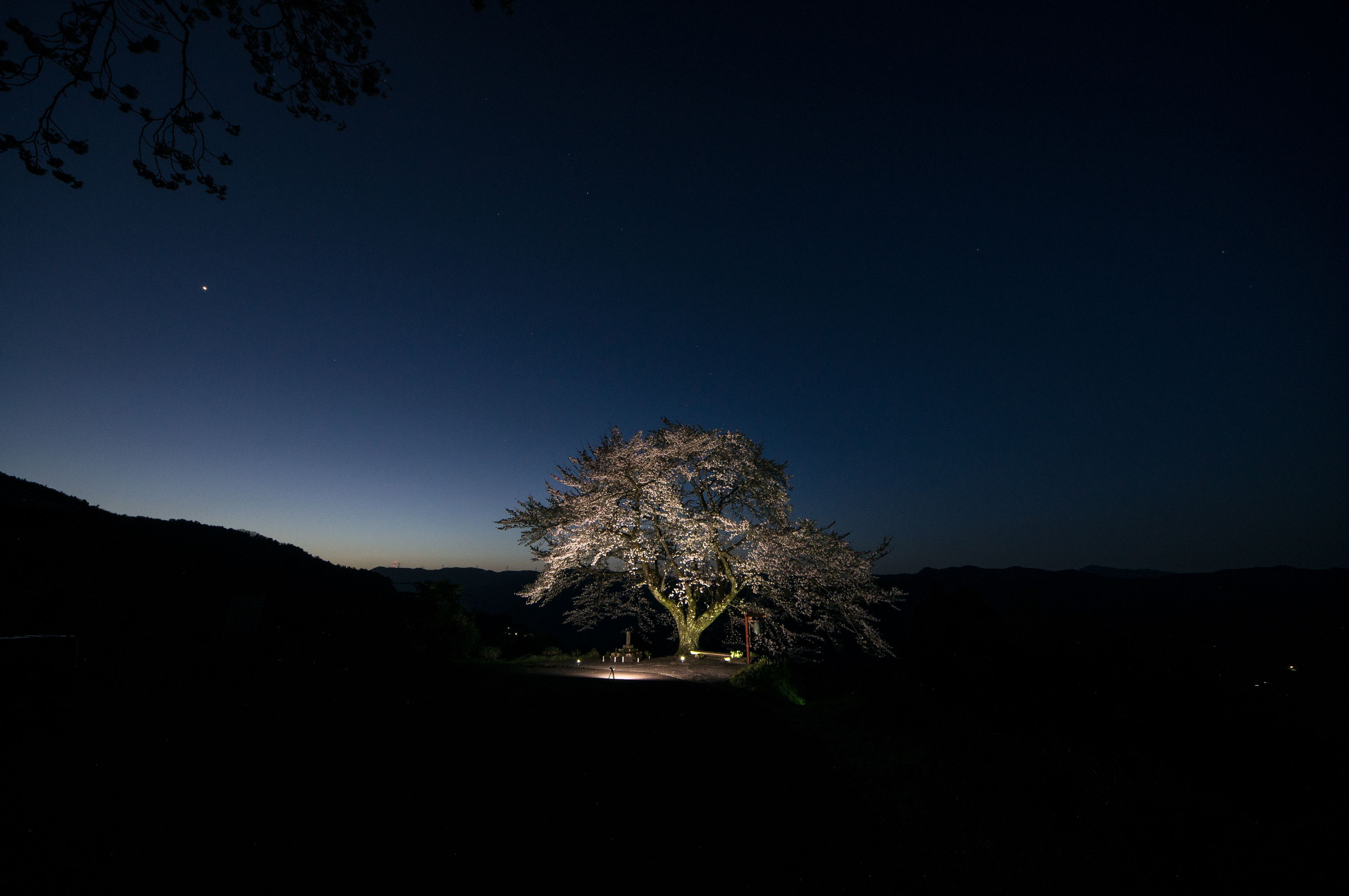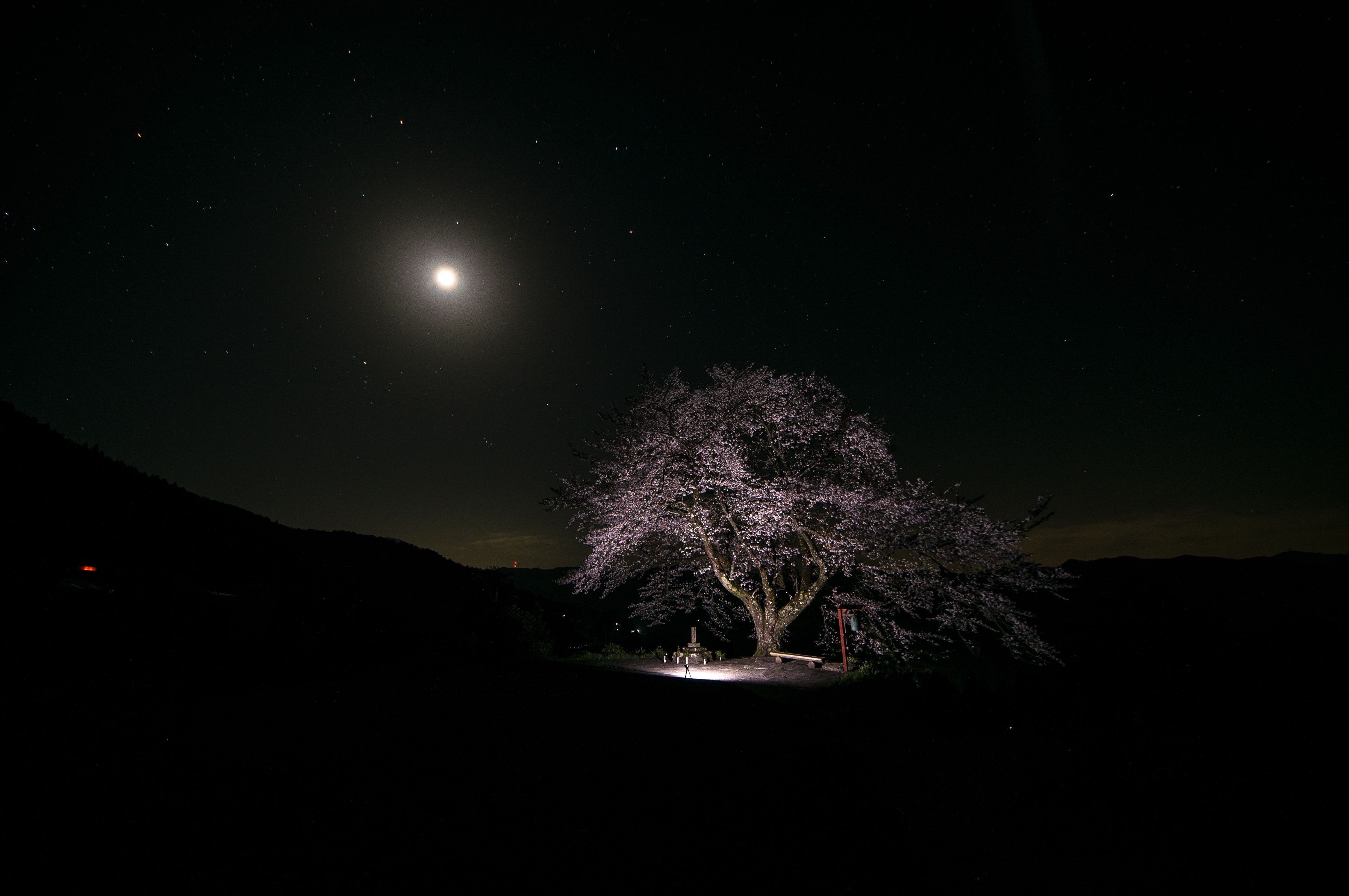 元来、此処にはライトアップの設備はありませんので、自前の照明器具を持ち込みました。 高演色性1000lm1個とCOB LED ライト4個を適当に配置しました。 一本桜となっていますが、実際はこの境内の入り口にもう一本あります。 この日は黄砂が酷くて空がオレンジ色になっていたのでかなり心配したのですが、意外と大丈夫だったみたい。