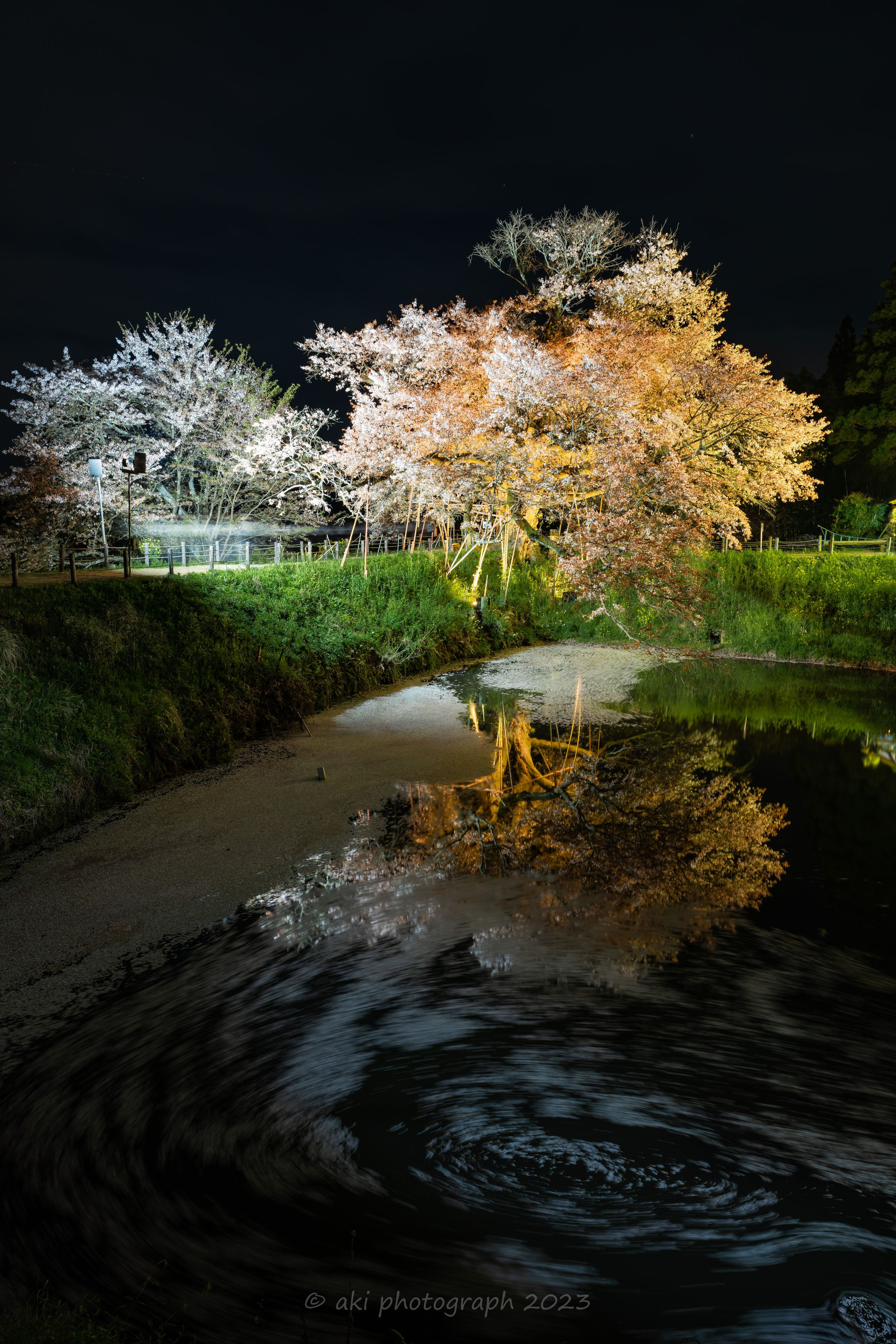 樹齢100年を超えるヤマザクラのライトアップ。 散った花びらの波紋が幻想的です。