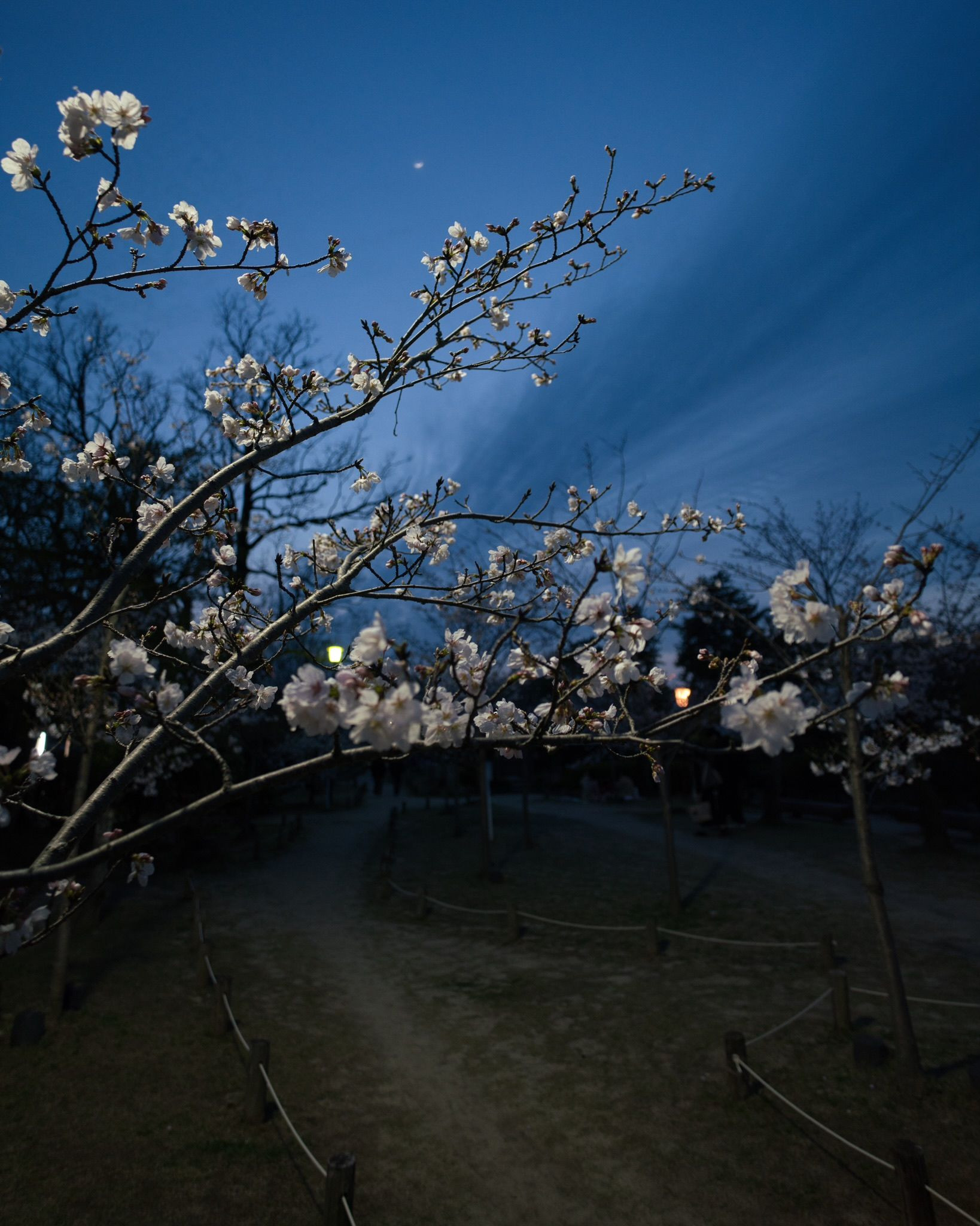 日没直後の桜 空が青く街灯に浮かび上がる桜🌸がキレイでした。 月が薄っすらと映り込んでます。😊