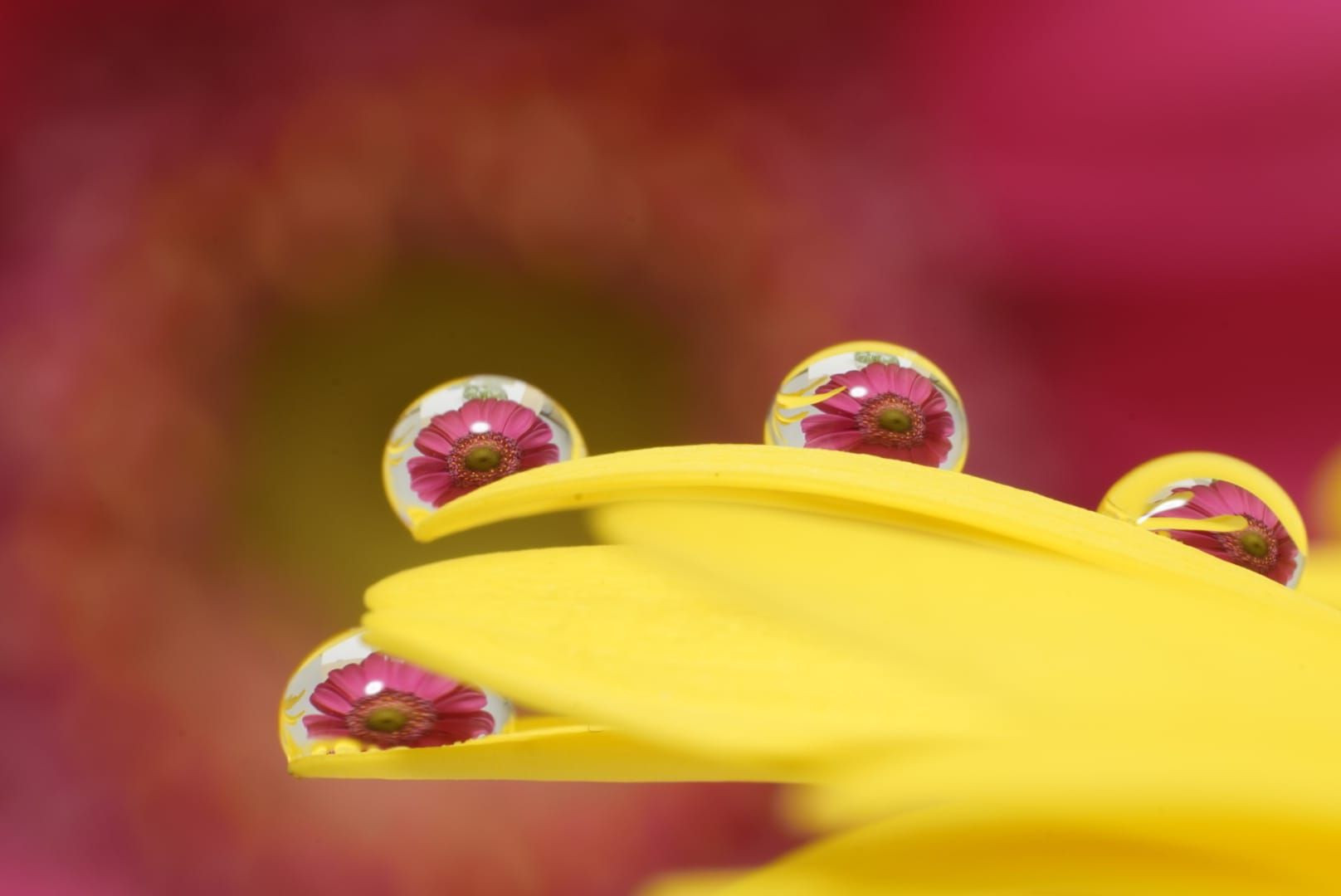 赤と黄のコントラストを意識してみました✨ 水滴に写し出された花はガーベラです✿