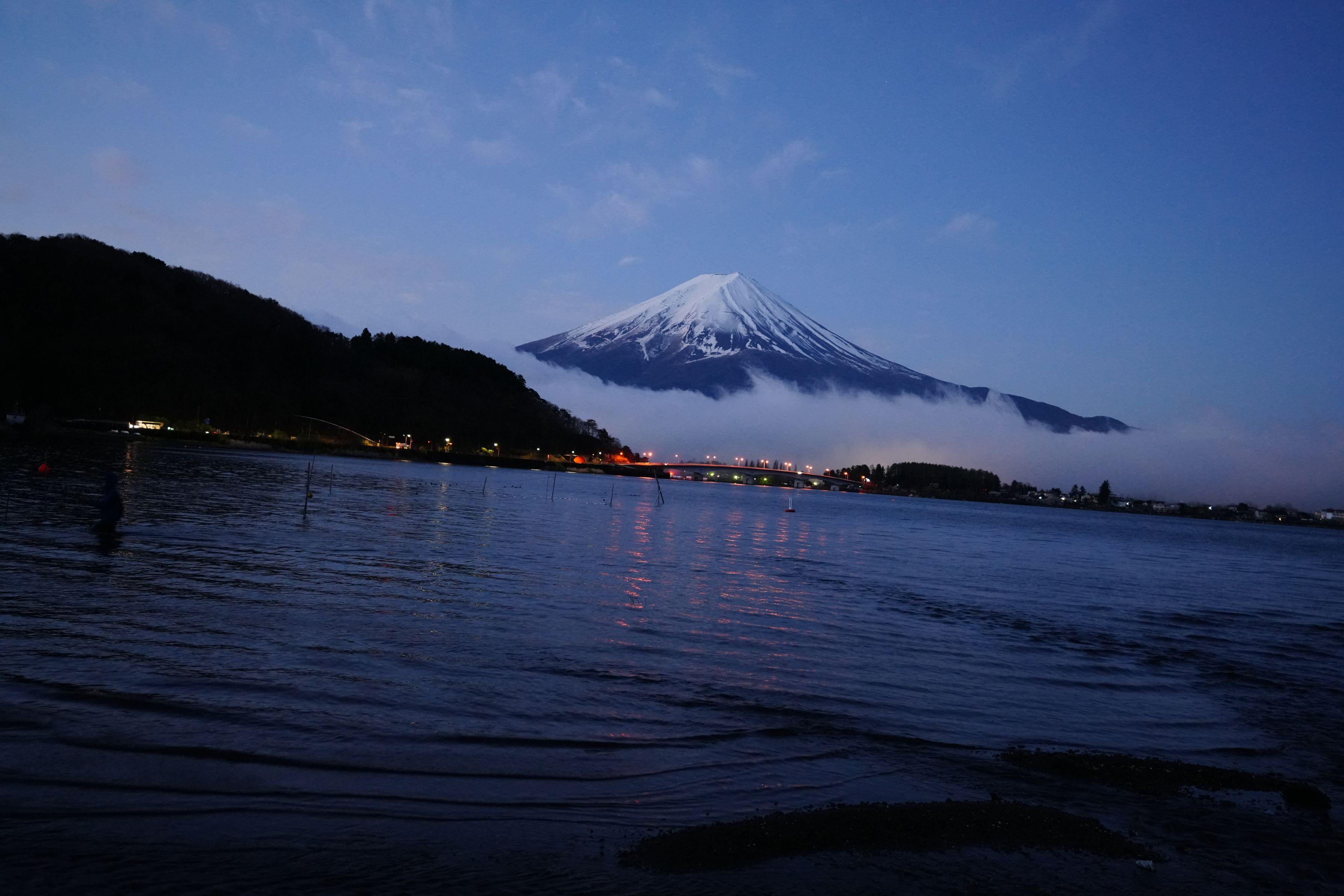 早朝の河口湖で霧から現れた富士山に圧倒されました。