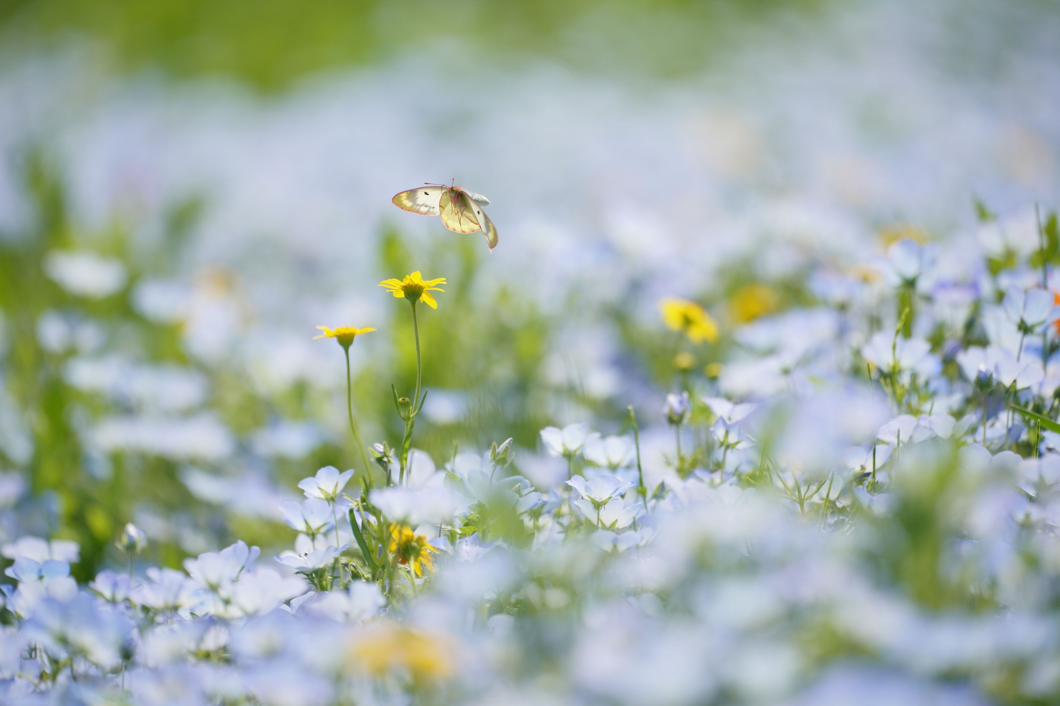 ネモフィラ畑で飛ぶ蝶を捉えることができました。