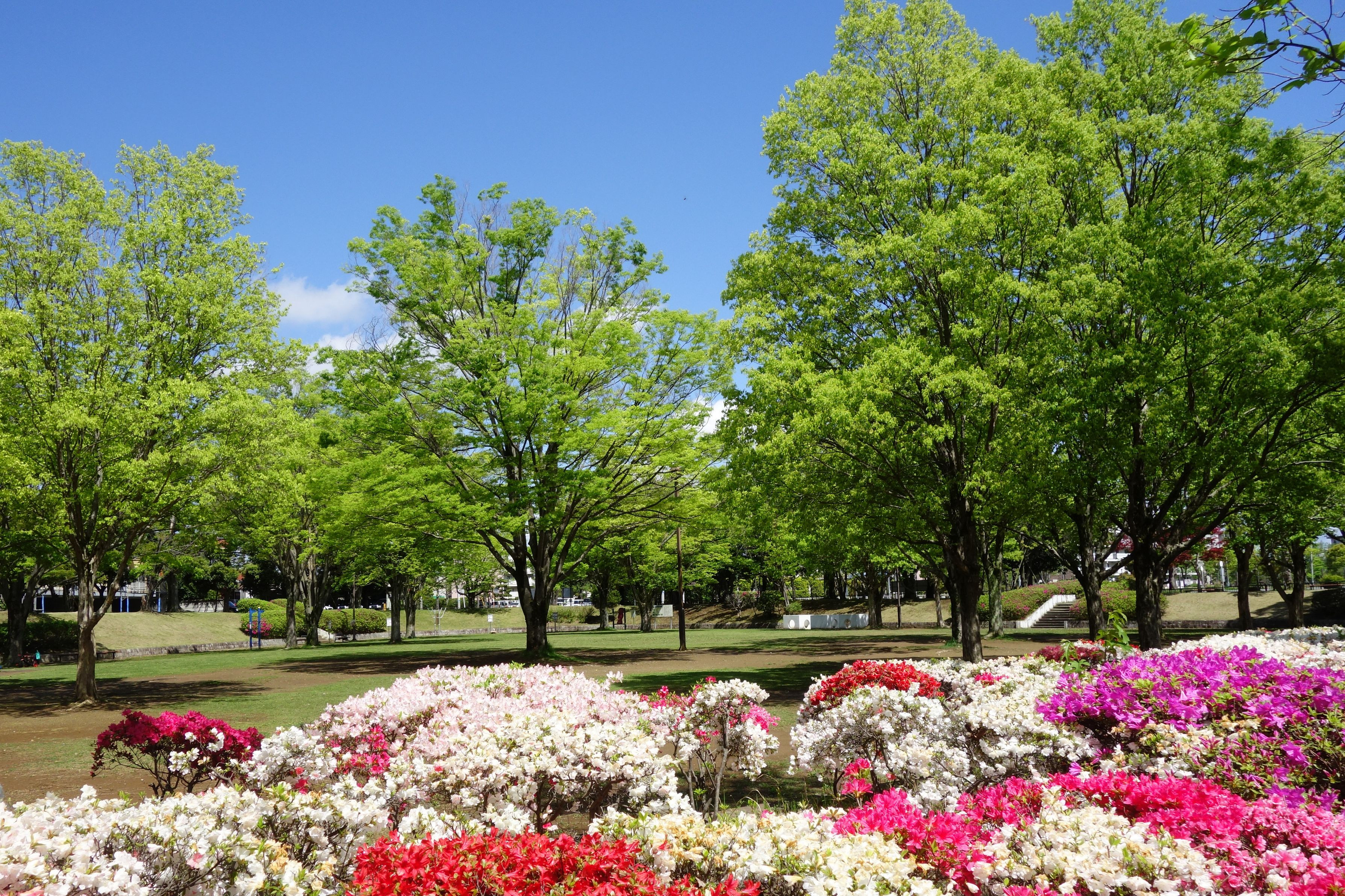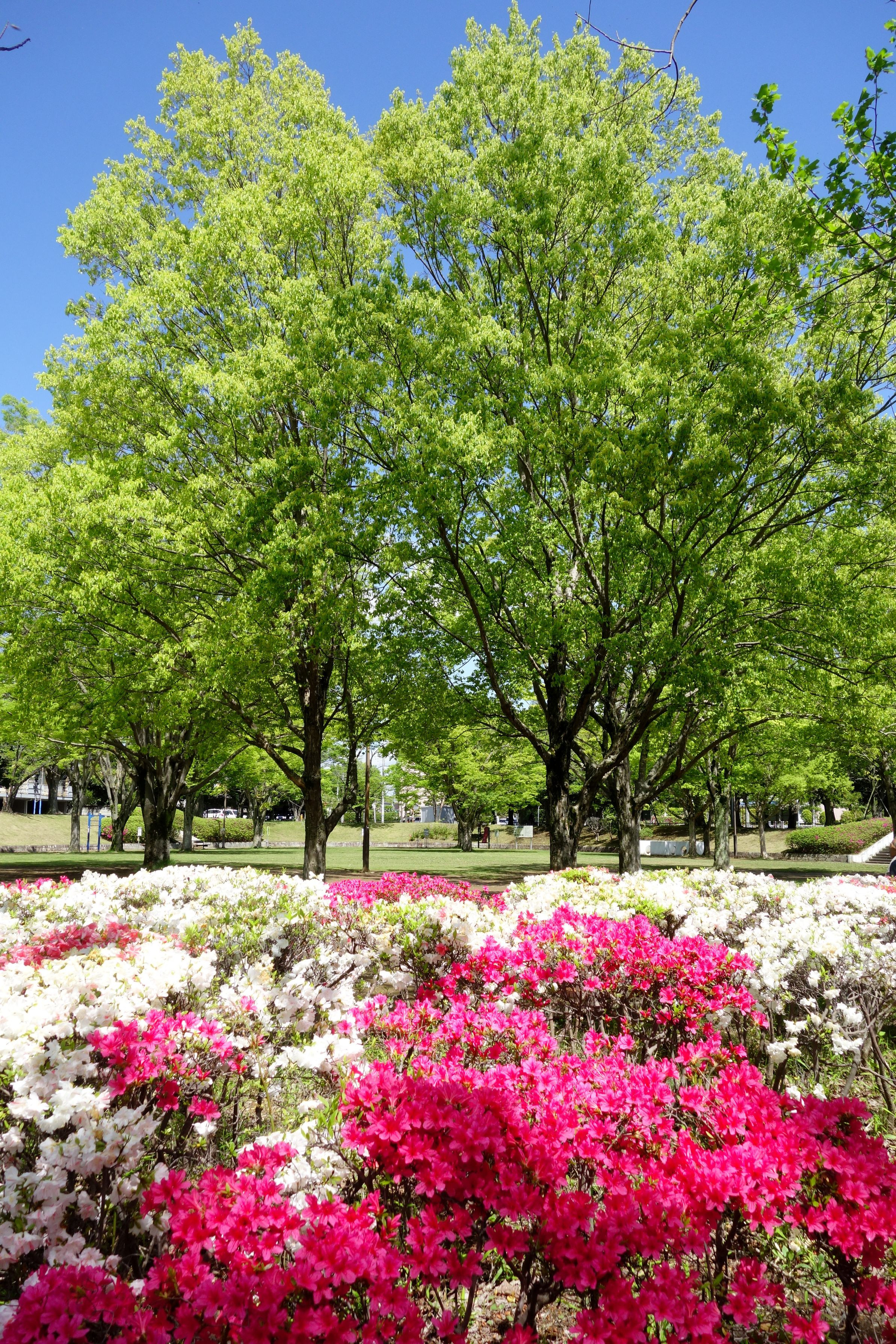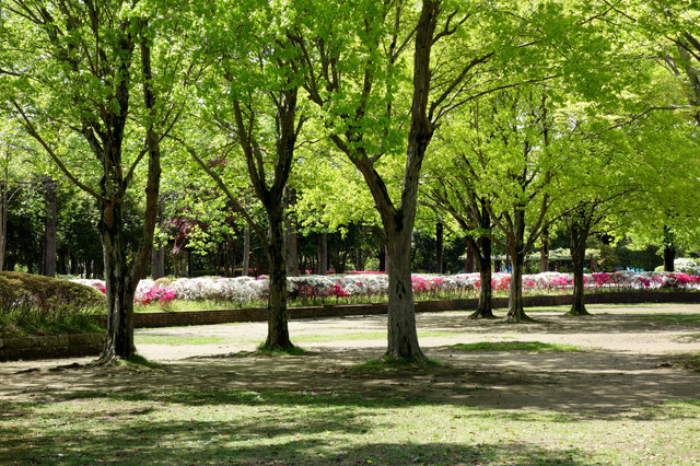 近くの公園の新緑が美しく、終わりかけのツツジを絡めて撮りました。