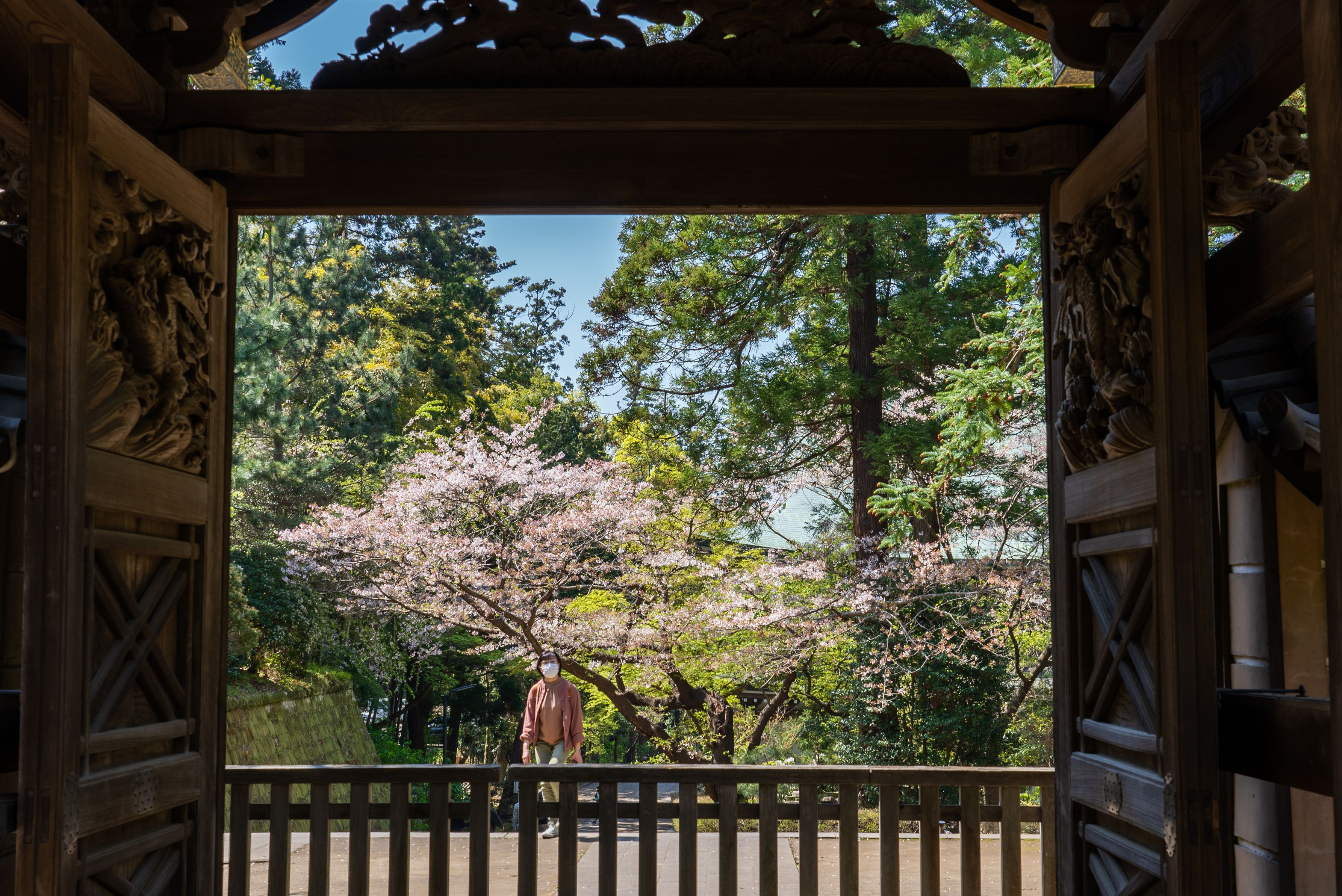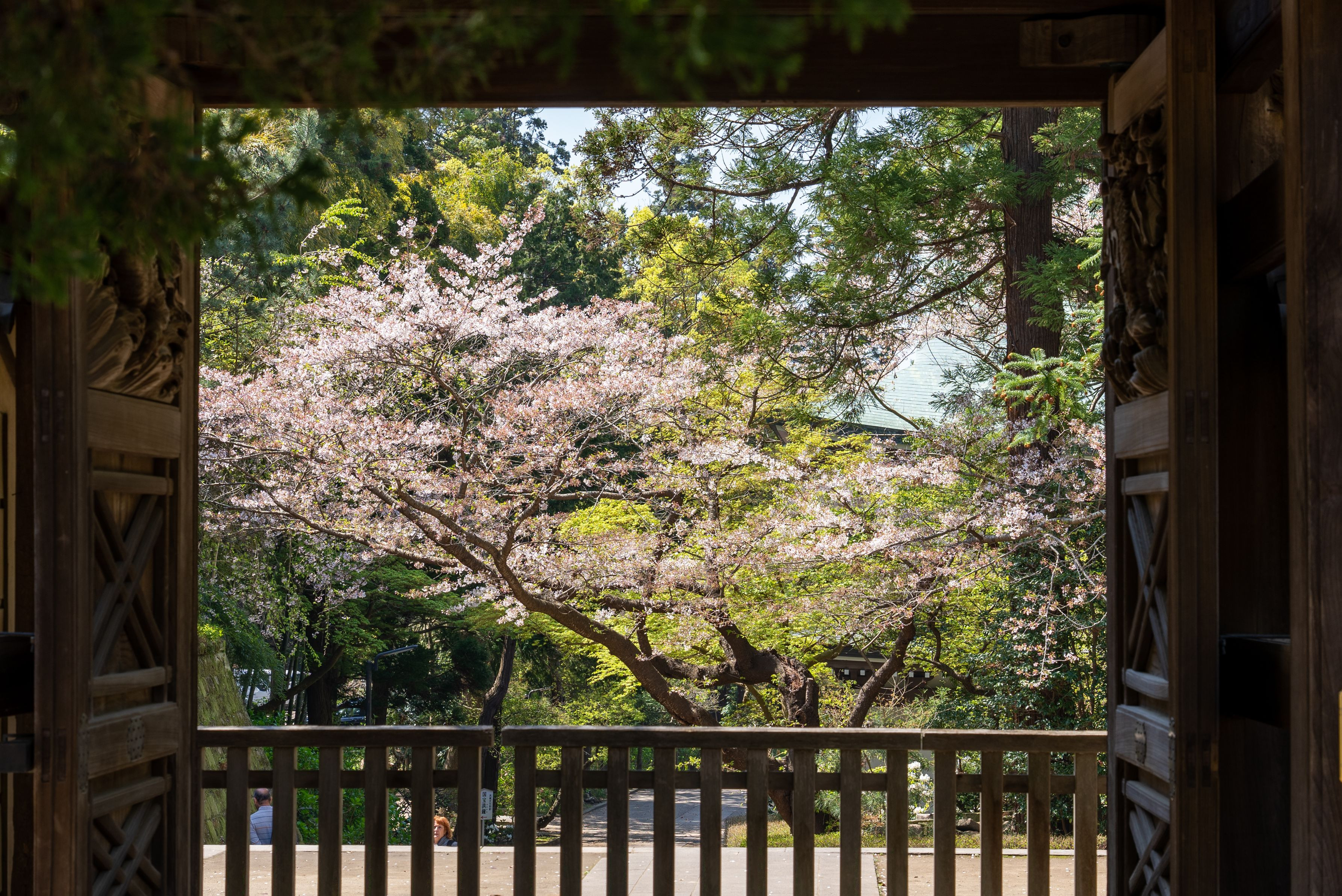 円覚寺の唐門から先の木々をのぞむ。暖かくなってきて桜やそのほかの木々がみなぎっていました https://www.engakuji.or.jp/grounds/