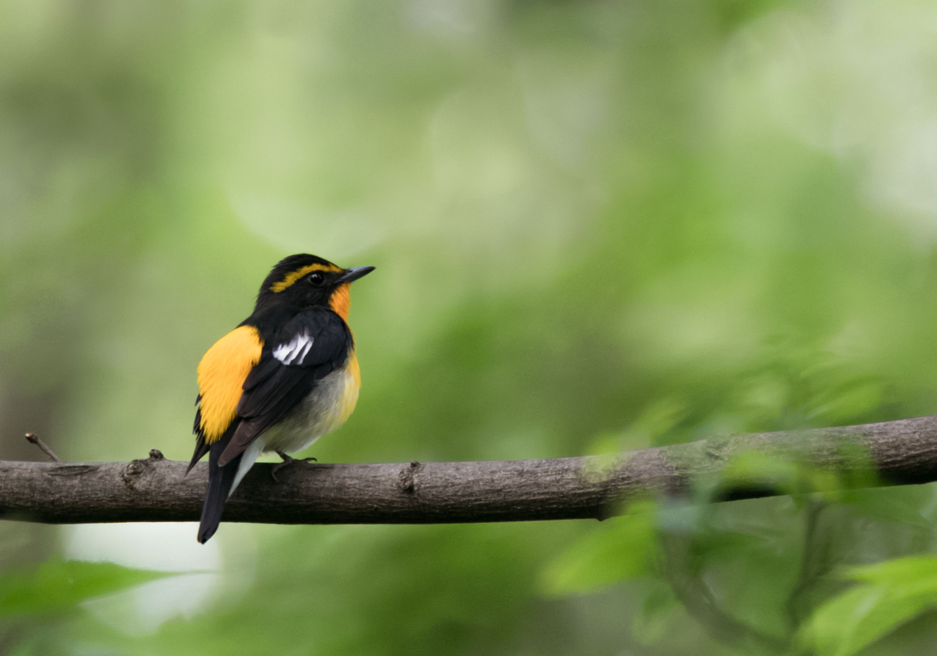 陽気に誘われて早速、夏鳥が到着していた。 ライムグリーンの中で輝くように見えたキビタキ雄。 だが、春は束の間の立ち寄り、早くも旅立って行った。