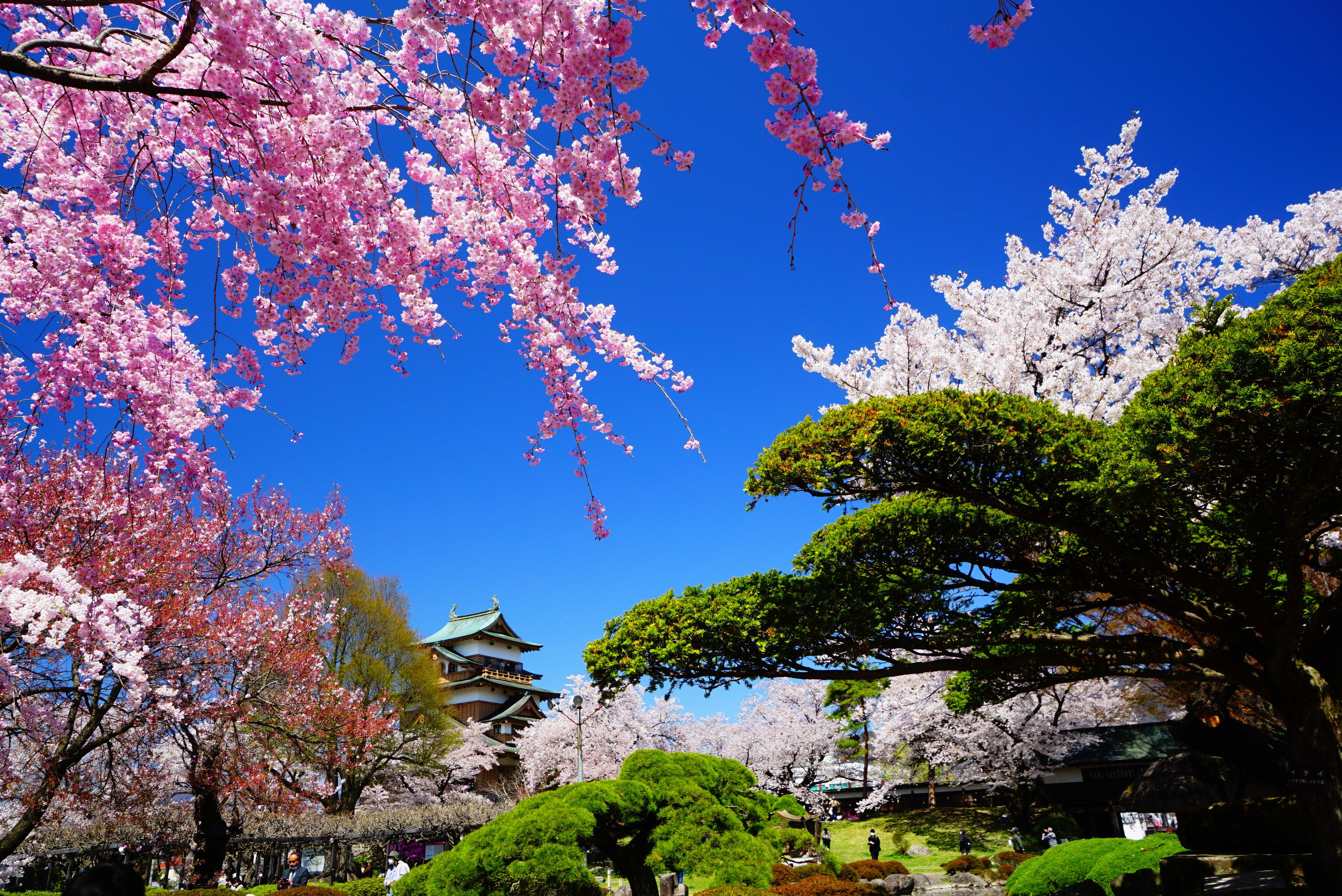 今年も高島城に桜を撮影に行ってきました。 この日は雲一つない快晴の空。桜は種類によっては散っていましたが、ぼんぼりのような桜は満開でした。桜も緑も空も城も入れたいと欲張ってみた結果、彩り豊かになりました笑