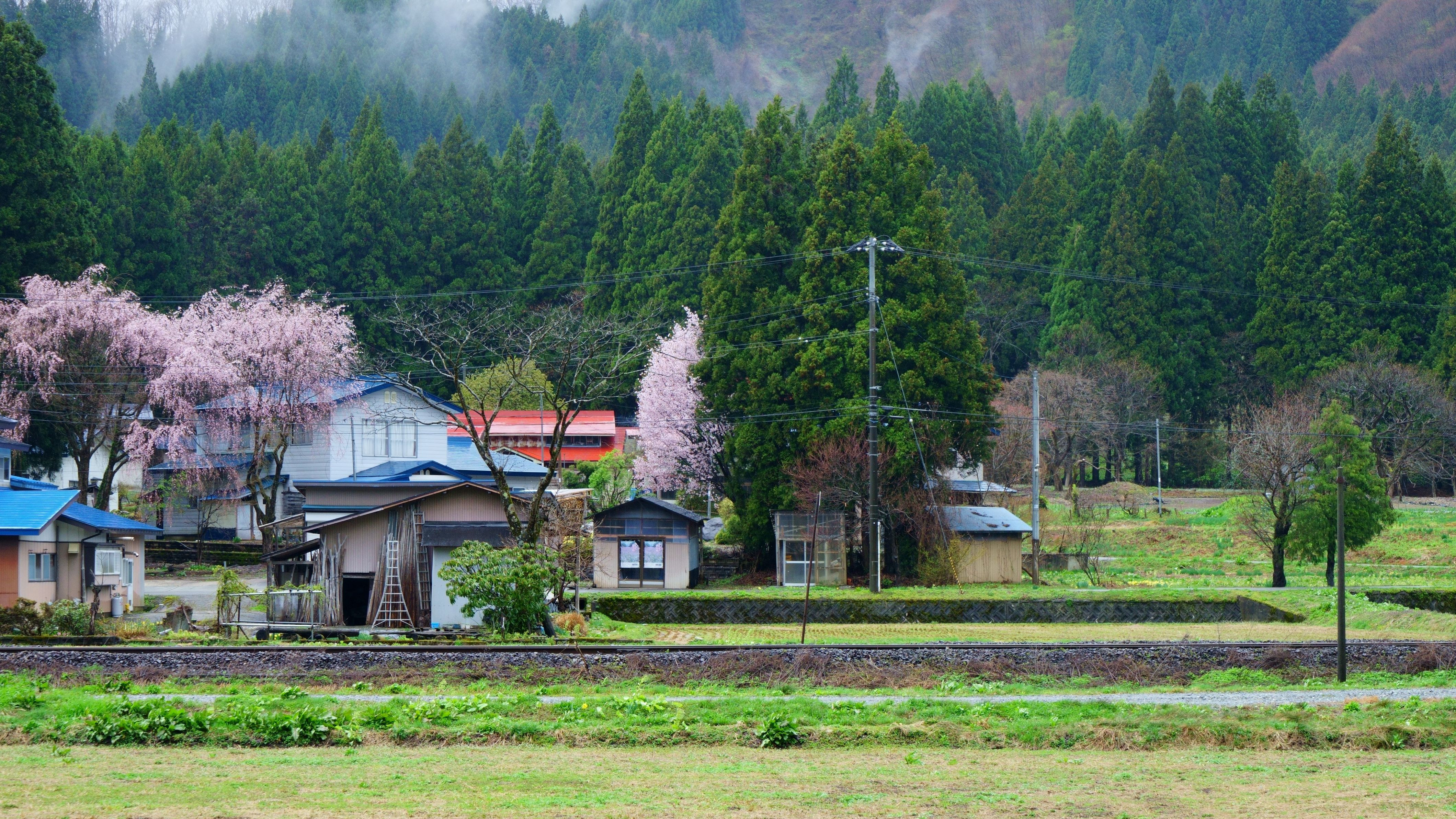 雨が上がり、生き生きと茂る緑の木々の中にひときわ目を引く桜。自然に包まれるようにゆったりと時間が流れる。