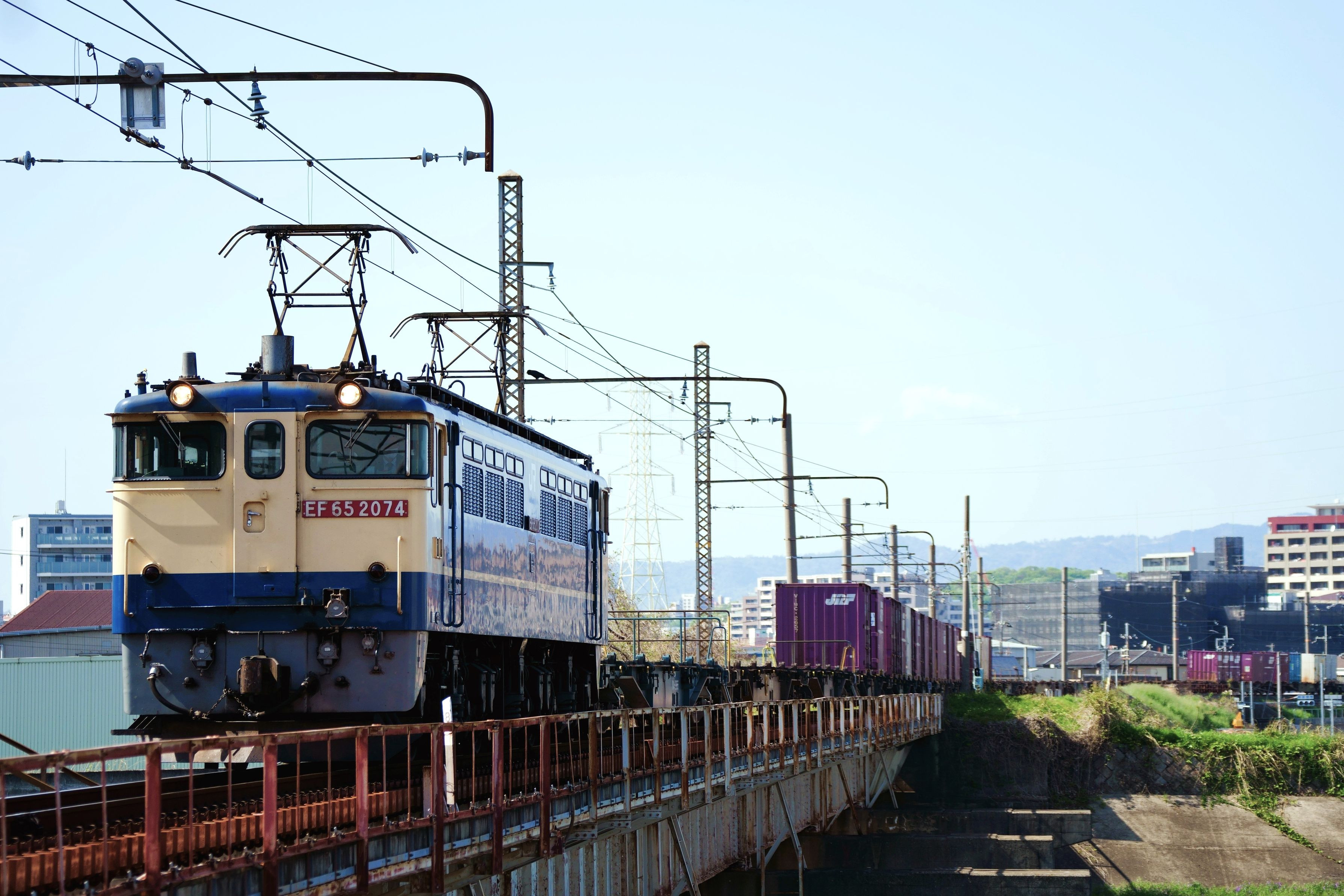 神崎川橋梁を渡る原色のロクゴ2074号機が5087レを牽いて百済貨物タを目指す 城東貨物線 吹田貨物タ西~神崎川信