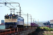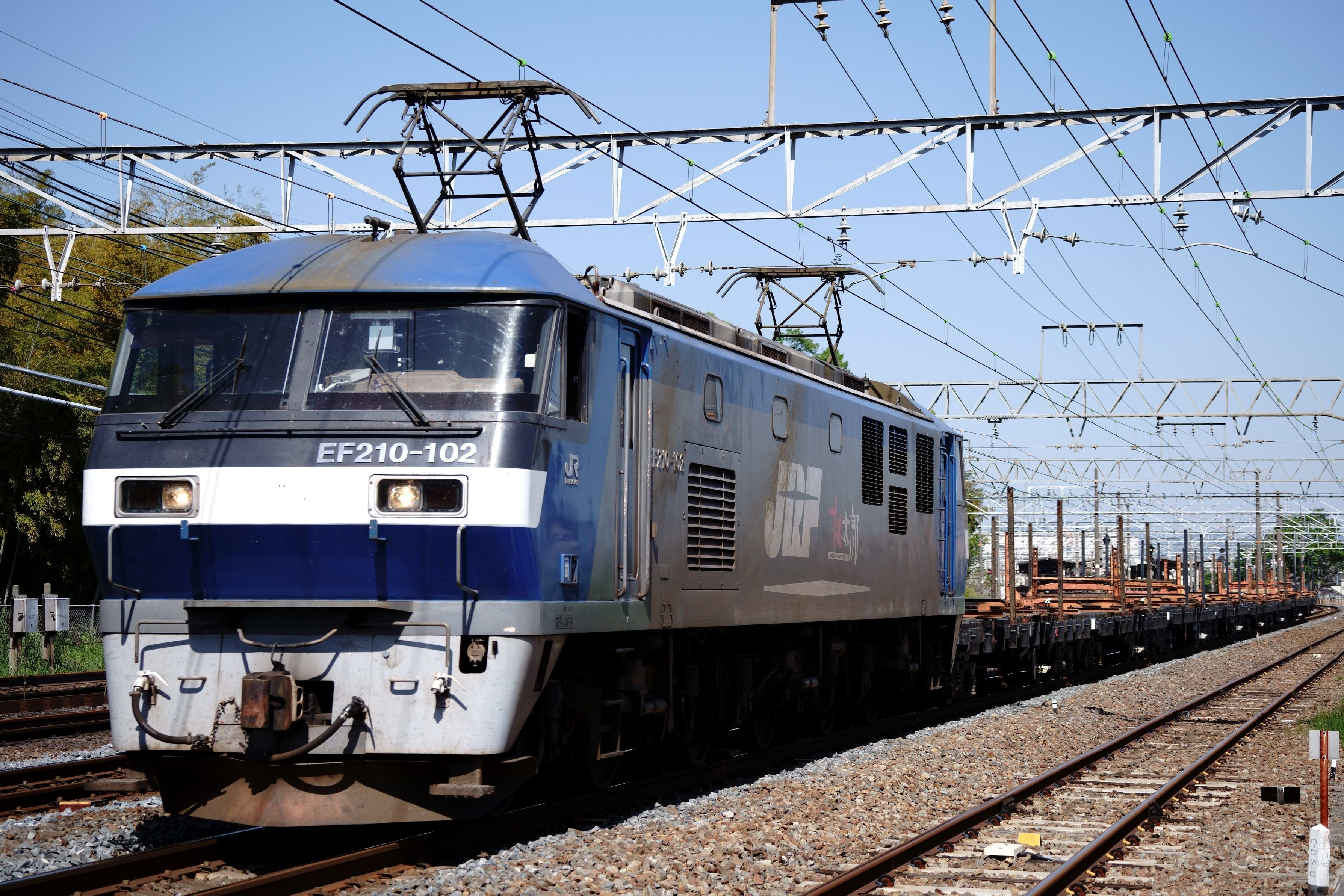 臨時貨物のレール運搬の8183レ空チキを牽引する原色桃太郎102号機がサントリ―カーブにやってきた 東海道本線 山崎~島本