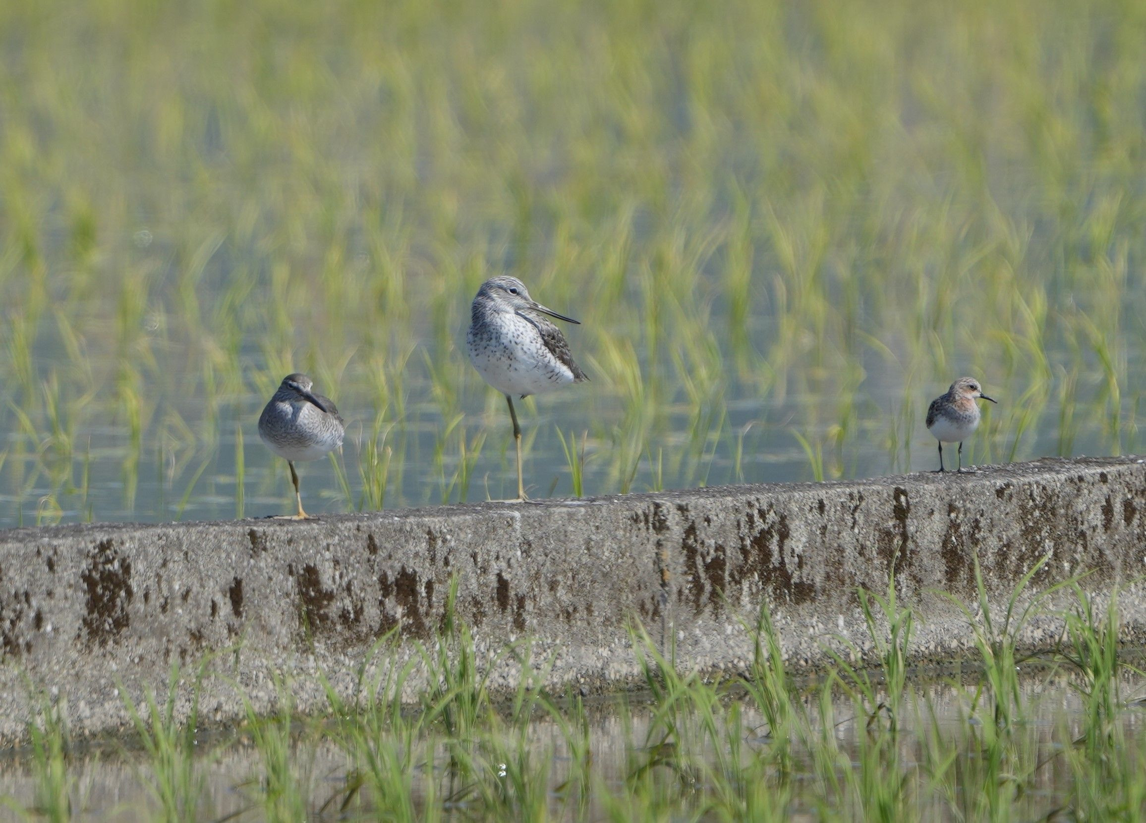 アオアシシギとキアシシギが仲良く並んでいる所にウズラシギと共にやって来たトウネン。何故かウズラシギの群れから離れて二羽の横でくつろいでいました。