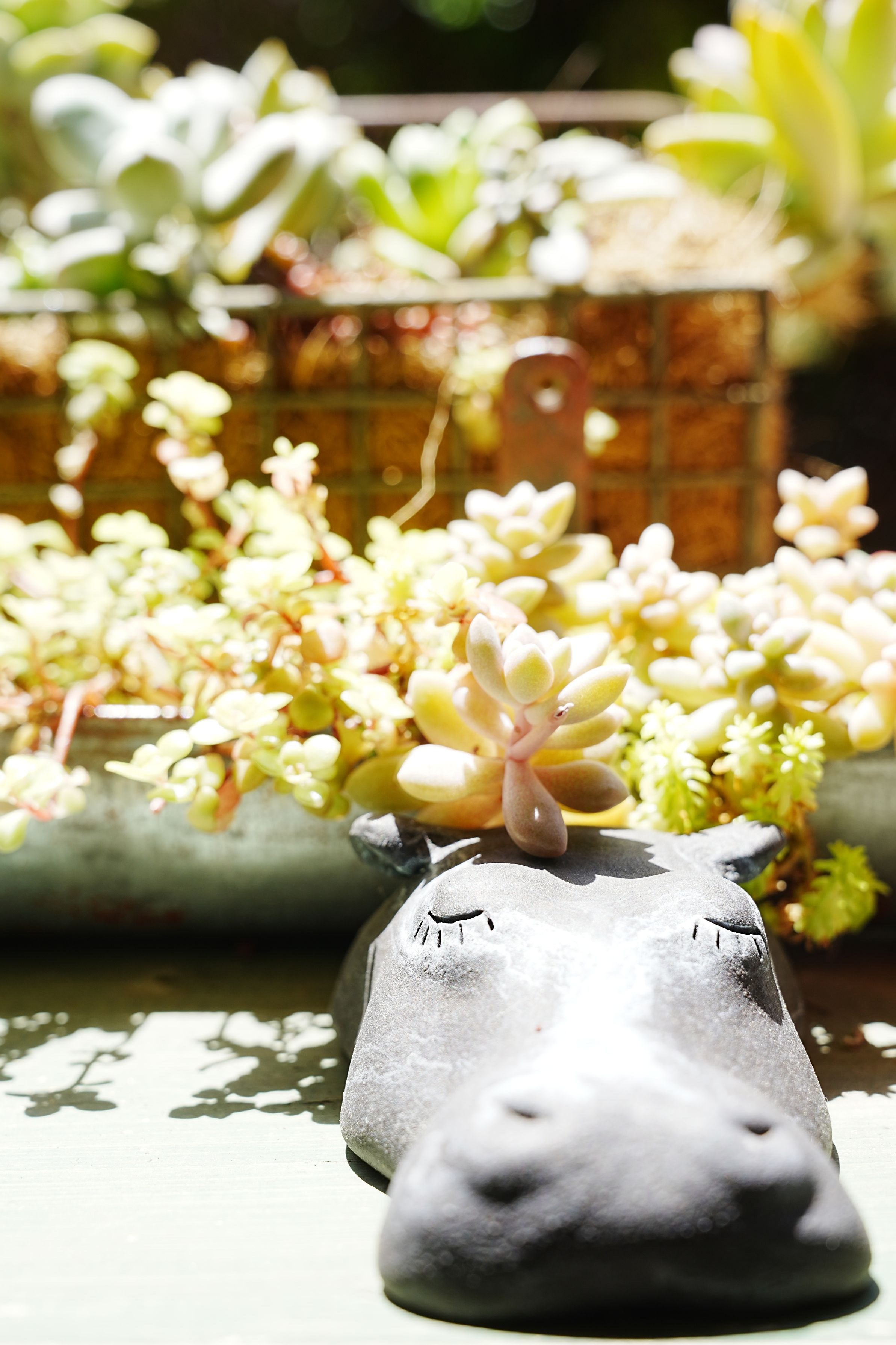 このカバ。 18年ほど前に、横浜の赤レンガ倉庫から迎えた子です。 多肉の鉢が転がらないようにと、重しがわりに置いているのですが、たまたま多肉がカバの髪飾りのようになって、かわいいなぁと思い、カメラを手に取りました。